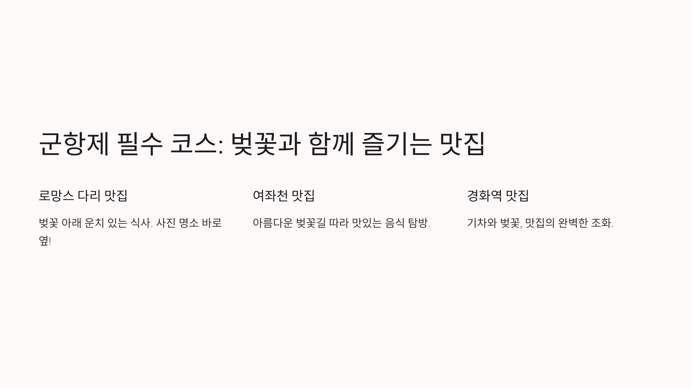 진해 군항제는 벚꽃만큼이나 음식도 즐겨야 제대로 된 여행이죠! 이번 군항제에서는 눈과 입이 모두 즐거운 맛집 탐방을 해보세요. 🌸🍜