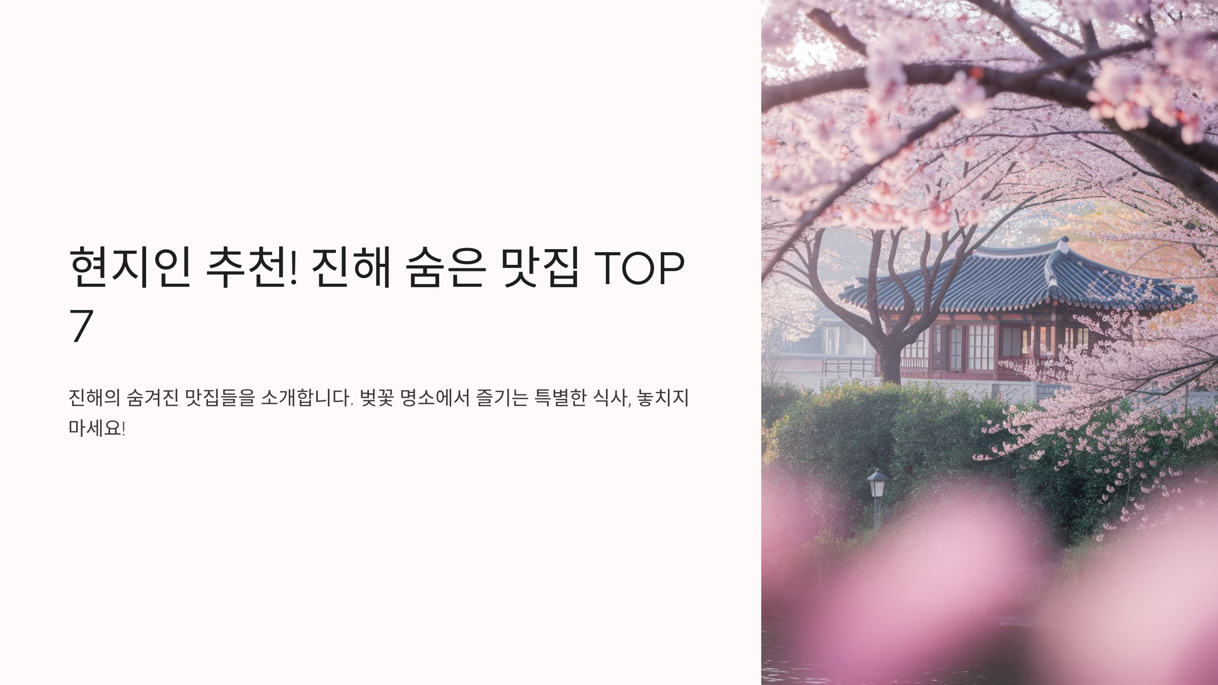 진해는 군항제뿐만 아니라 현지인들이 사랑하는 숨은 맛집이 많아요. 관광객들에게 잘 알려지지 않았지만, 한 번 가면 단골이 되는 곳들이죠. 신선한 해산물부터 정성 가득한 한식까지, 진해에서 꼭 가봐야 할 7곳을 소개할게요! 🍽️