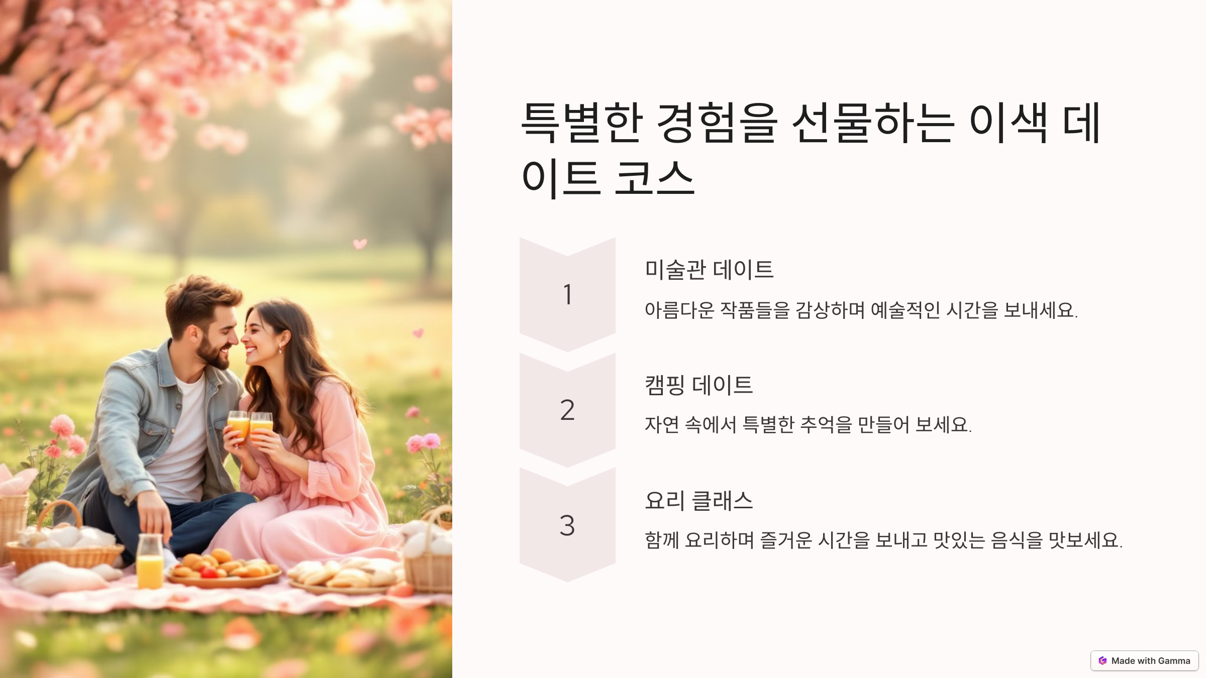 🚀 **다음 섹션에서 특별한 경험을 선물하는 이색 데이트 코스 추천이 자동 출력됩니다!**
