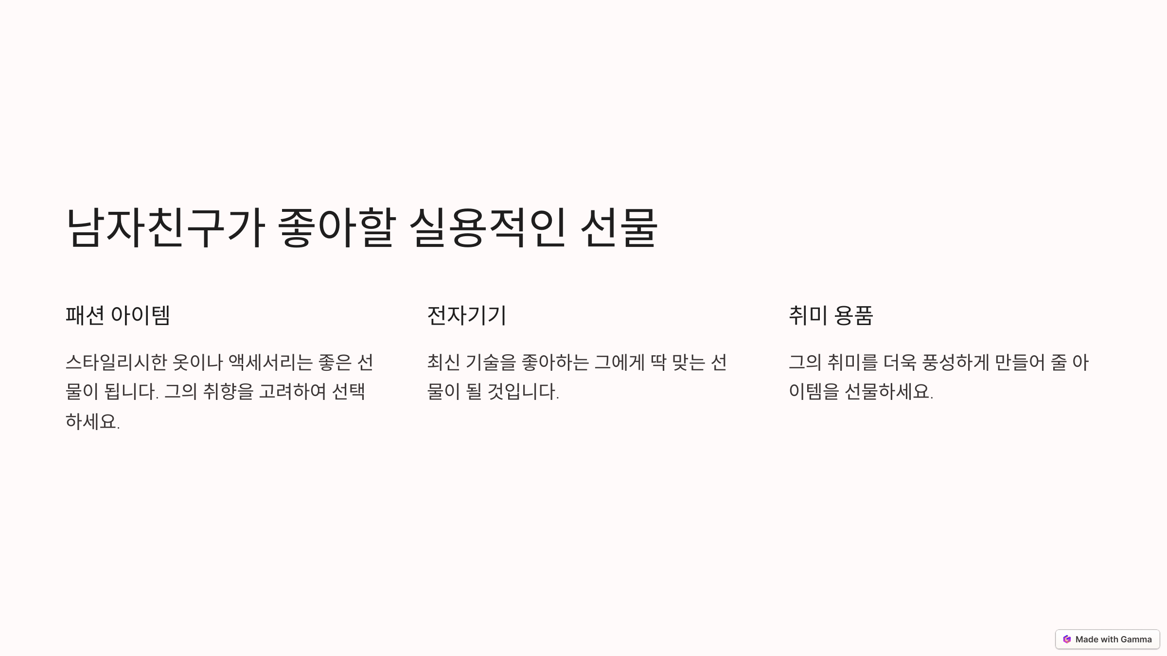 🚀 **다음 섹션에서 남자친구가 좋아할 실용적인 선물 추천이 자동 출력됩니다!**