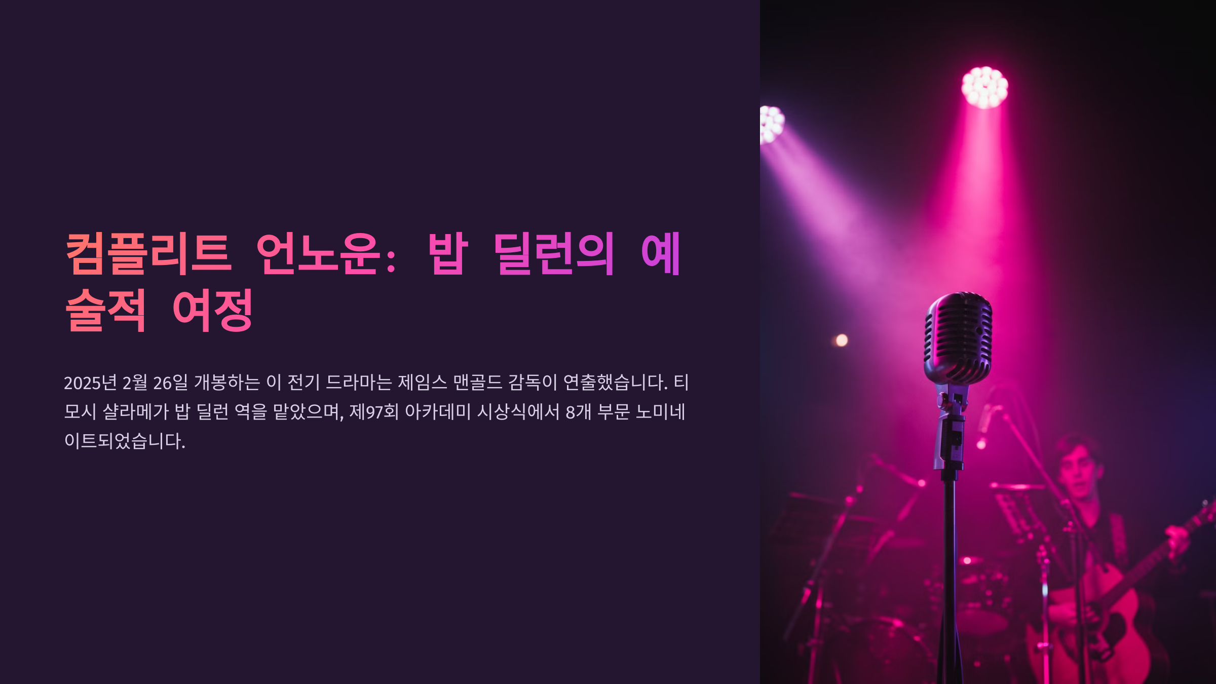| 컴플린트 언노운 | 미스터리, 스릴러 | 제임스 맨골 | 티모시 샬라메,에드워드 노튼.엘르 패닝 | 2025년 개봉 |