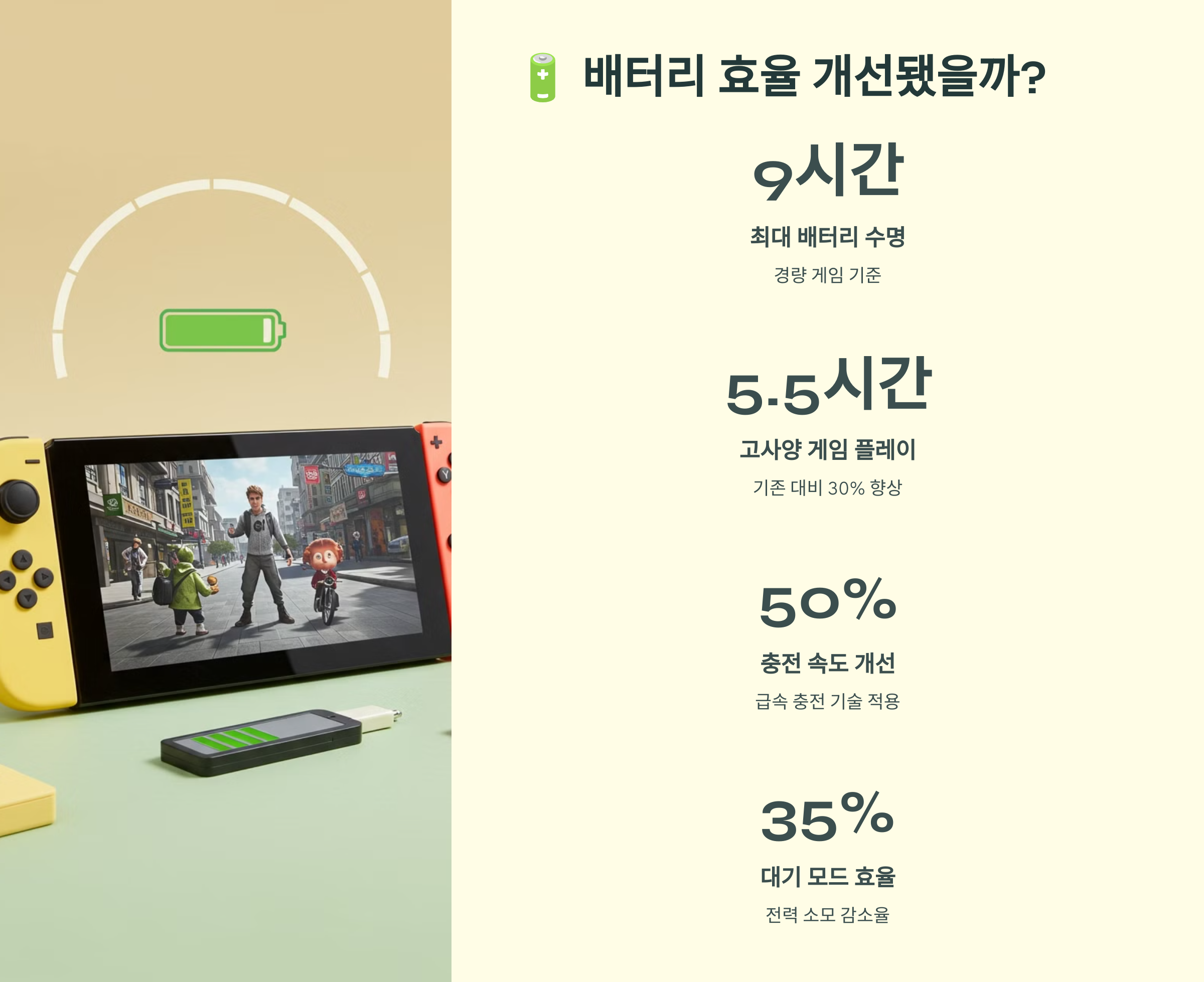 이처럼 스위치2는 성능이 향상되었음에도 불구하고 전반적인 배터리 효율은 좋아질 가능성이 높아요. 실제 게임 플레이 시간 기준으로도 기존 대비 약 1~2시간 이상 더 오래 사용할 수 있다는 분석이 많아요.
