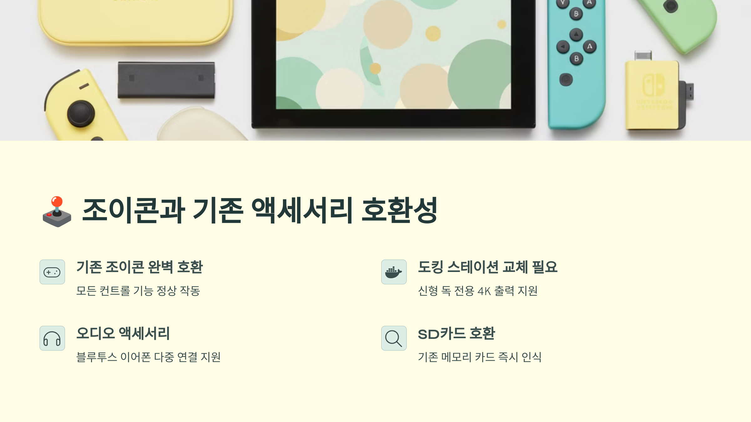 결론은? 조이콘과 충전기는 대부분 호환될 것으로 보이지만, 독과 케이스는 신형 기준으로 교체가 필요할 수도 있어요. 특히 4K 지원 독은 닌텐도 측에서 별도 패키지로 판매할 가능성이 높아요.