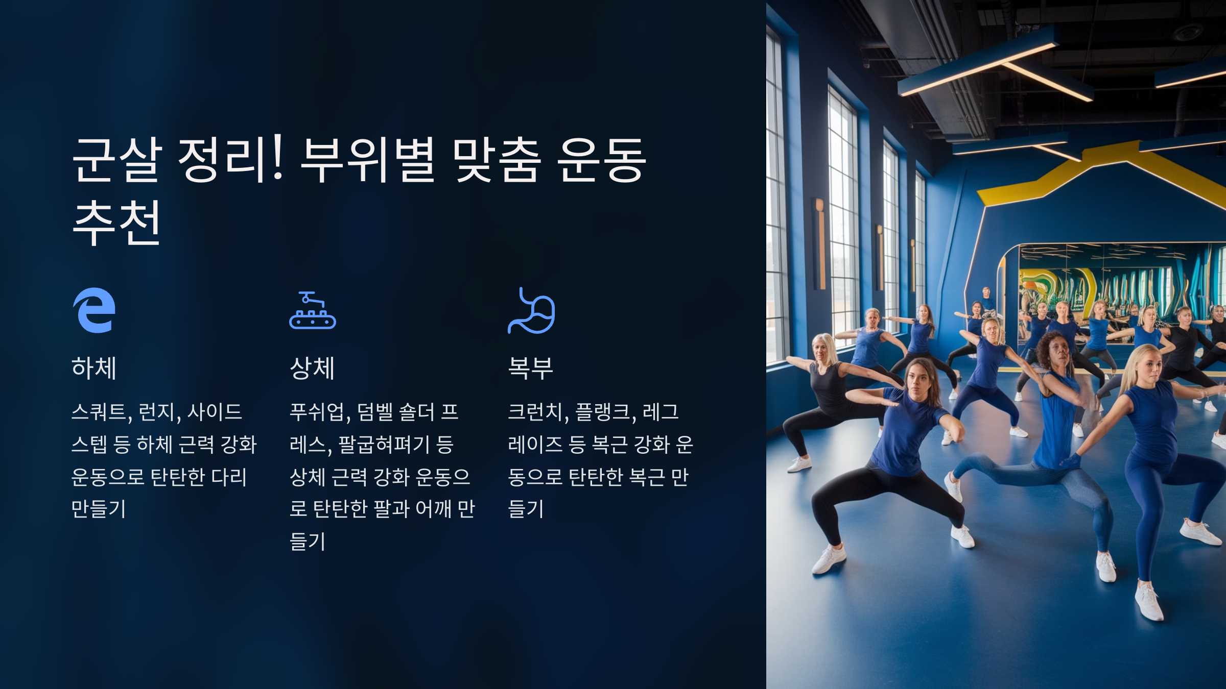 | 복부 | 크런치 15회 × 3세트 | 뱃살 제거 & 탄력 강화 |