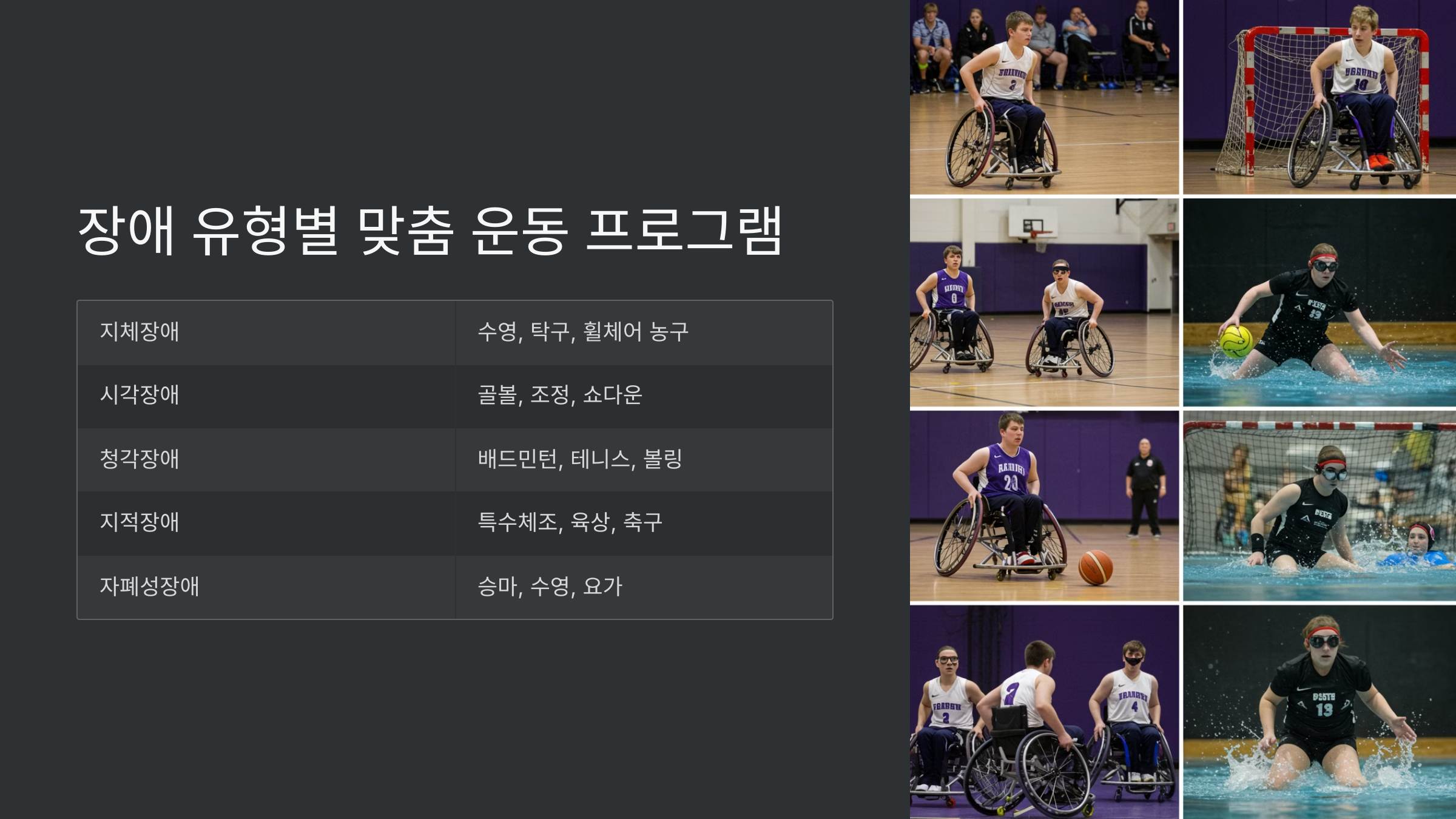 | 지체 장애 | 휠체어 농구, 수영, 사이클 | 하체 근력 보강 & 균형 유지 |