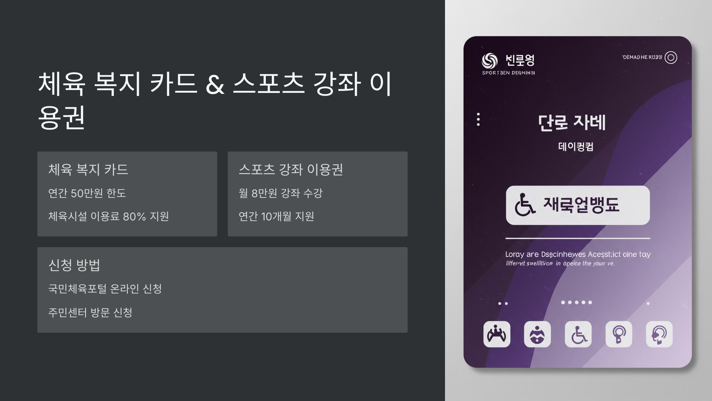 - ✔️ 장애인을 위한 체육 시설 이용 할인 카드