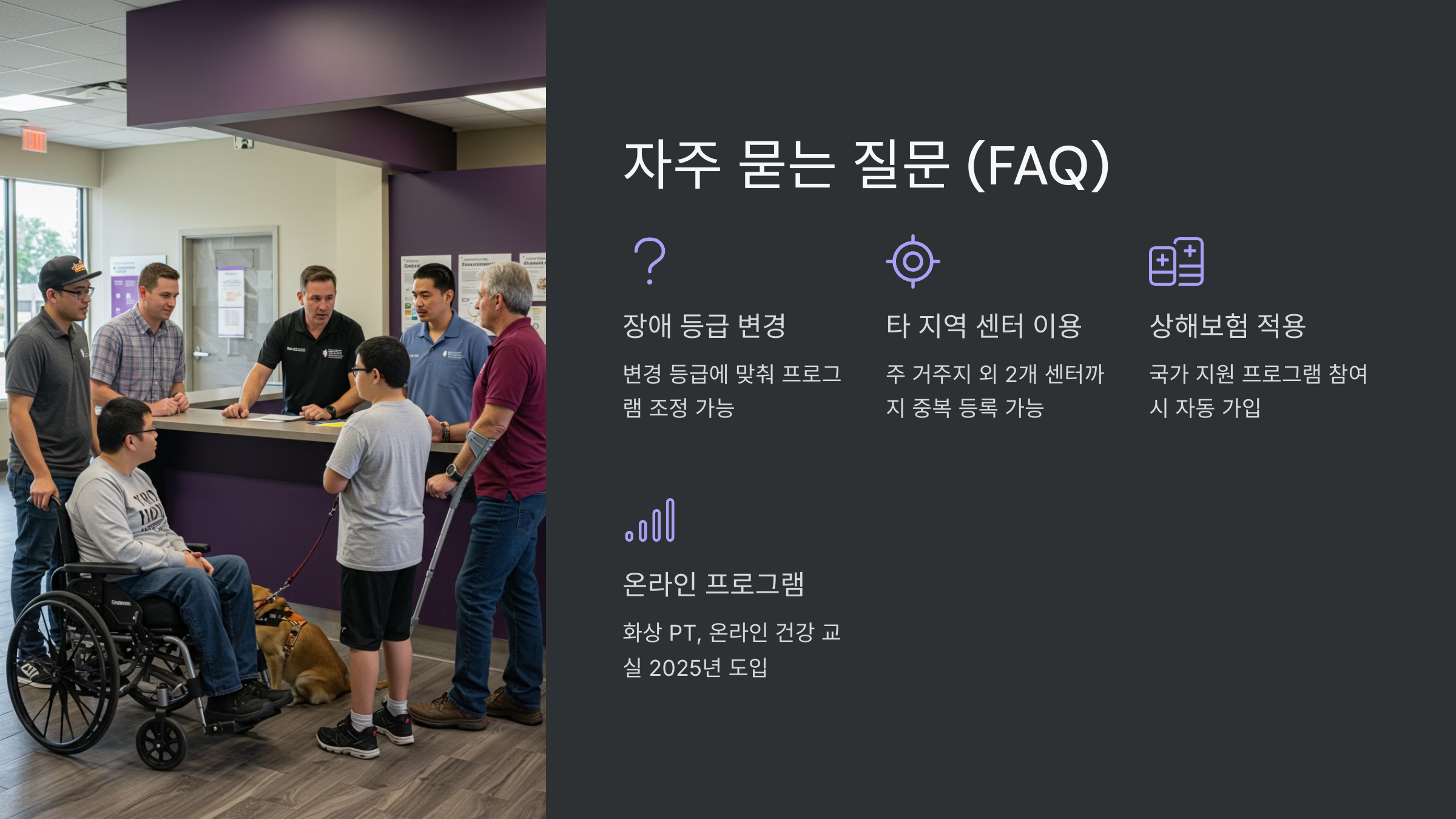 A3. 대한장애인체육회(KPC) 홈페이지나 거주 지역 주민센터에서 가까운 장애인 체육센터를 확인할 수 있어요. 🏢