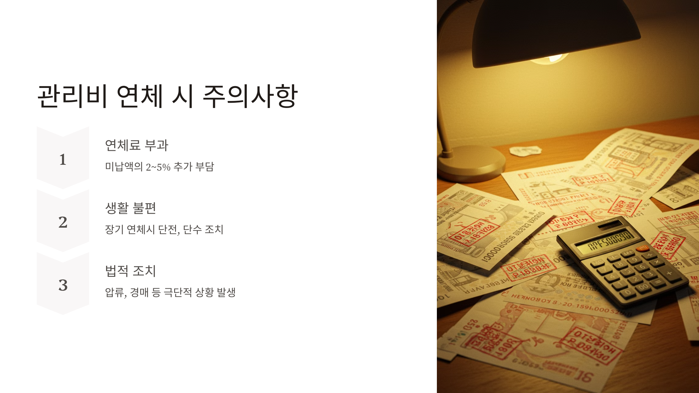 관리비를 연체하면 연체료가 발생할 뿐만 아니라 전기·수도 제한 등의 불이익을 받을 수 있어요. 장기간 미납하면 법적 조치까지 진행될 수 있으니 꼭 기한 내 납부하세요! ⚠️💰