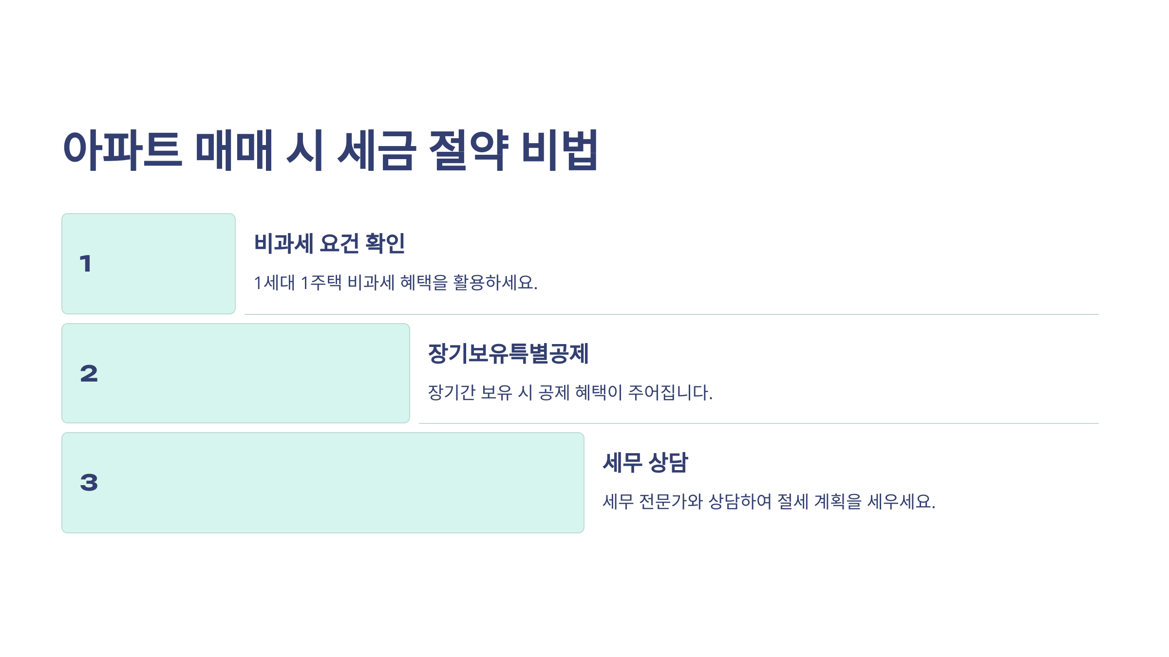 아파트 매매 시 가장 중요한 세금은 **취득세, 재산세, 양도소득세**예요. 취득세는 **아파트 가격의 1~3%** 정도이며, 9억 원이 넘으면 세율이 높아져요. 따라서 **9억 원 이하 매물을 고려하면 세금 부담을 줄일 수 있어요**. 📉