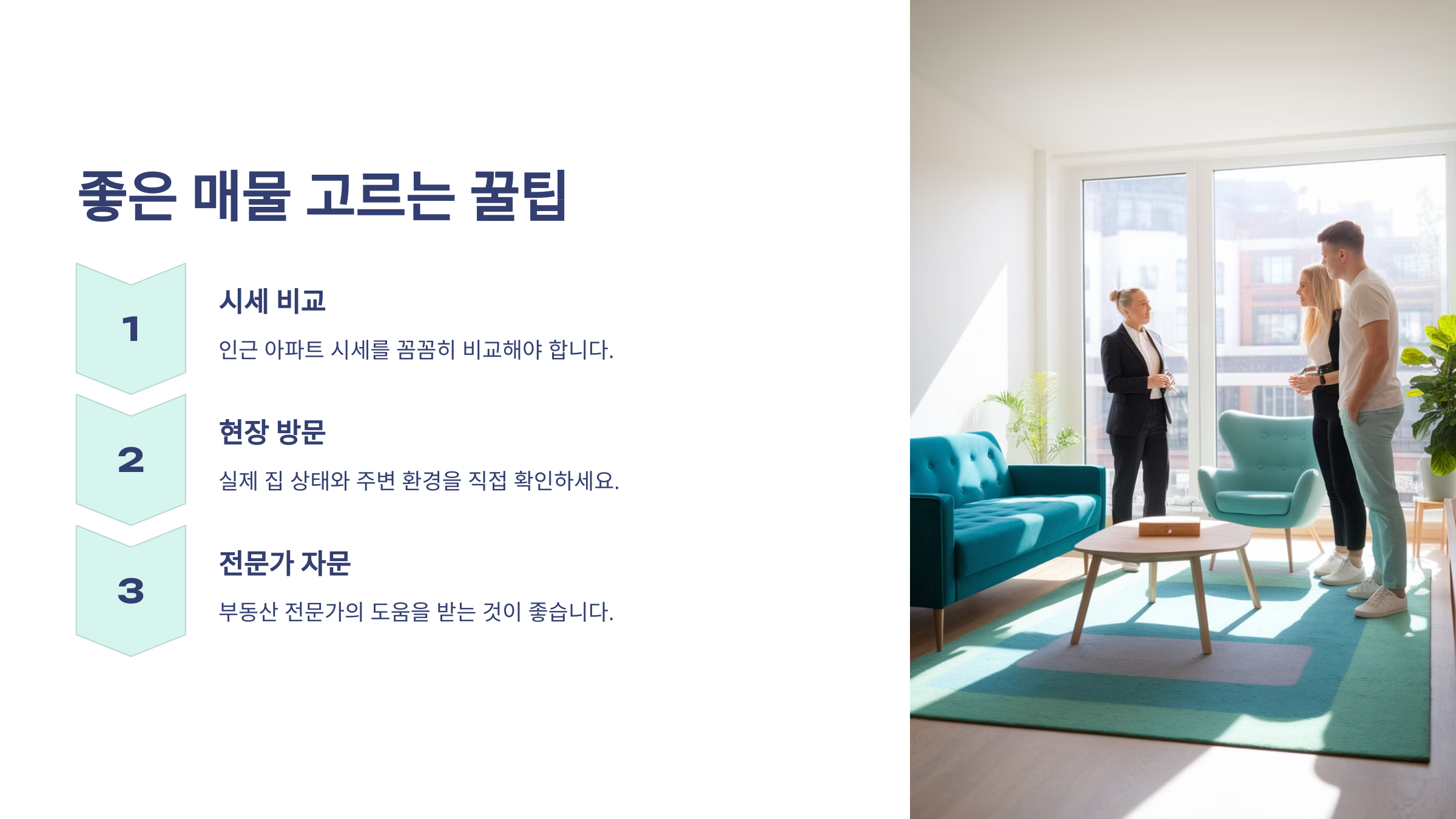 좋은 매물을 고르려면 **입지, 단지 환경, 층수, 향까지 꼼꼼히 체크하세요**. 전문가들은 이 요소들을 보고 시세 상승 가능성을 예측해요! ✅