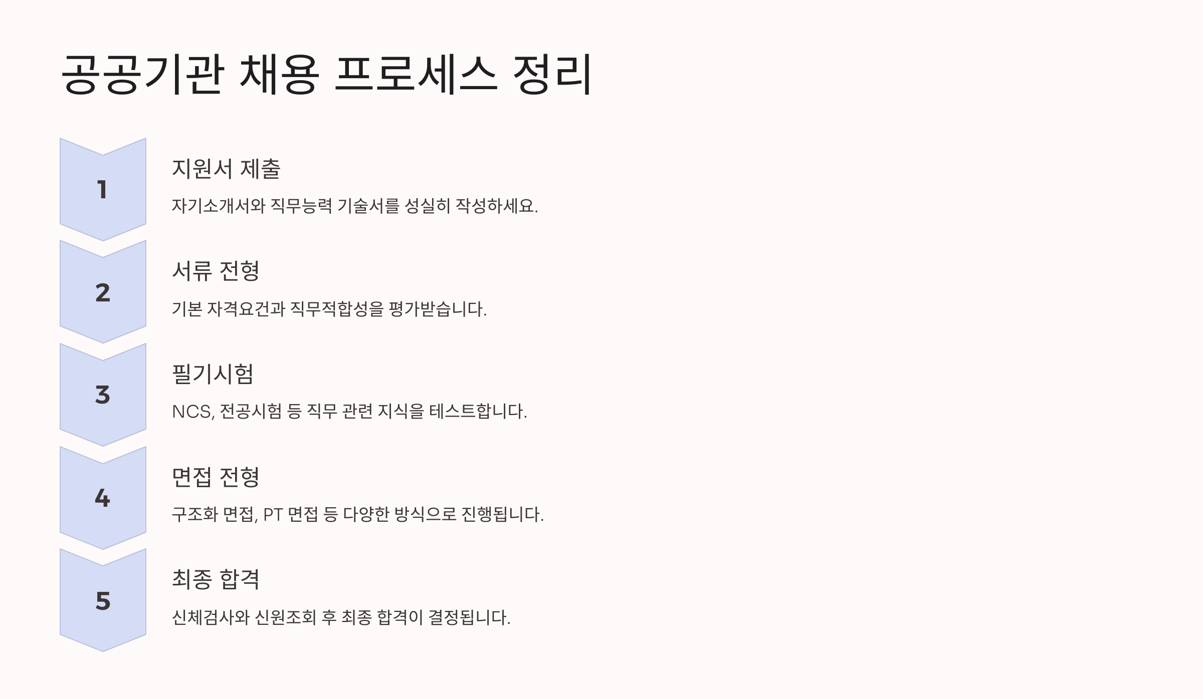 채용 프로세스가 길고 복잡해 보이지만, 단계별로 철저히 준비하면 충분히 합격할 수 있어요! 특히 면접에서는 직무 관련 질문과 함께 기관의 가치와 비전에 대한 질문이 자주 나오니, 미리 공부해 두는 것이 좋아요.