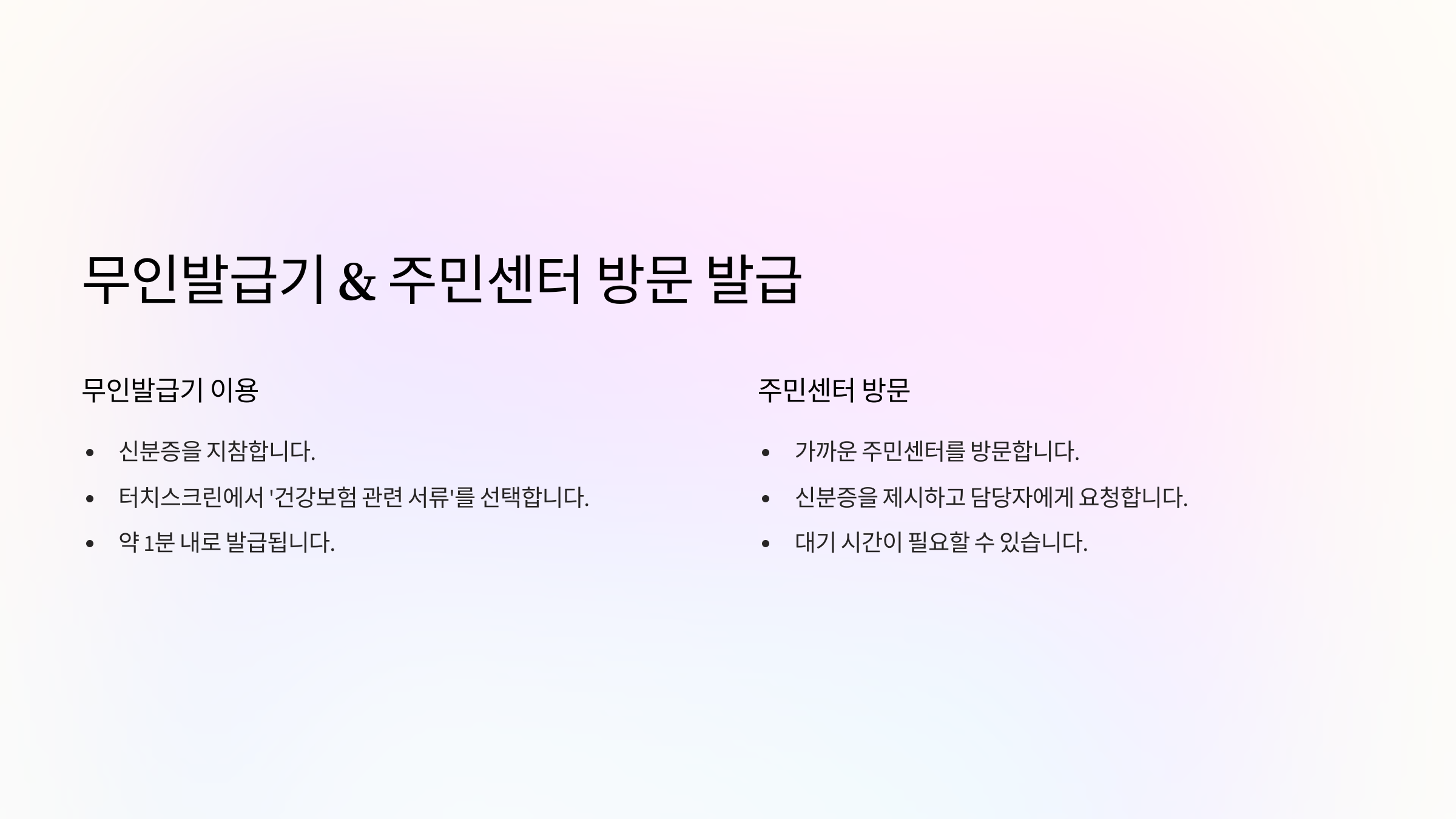 | 🏧 무인발급기 | 주민센터, 보건소, 지하철역 등 | 24시간 가능 (일부 발급기) | 주민등록번호 입력 후 발급 |