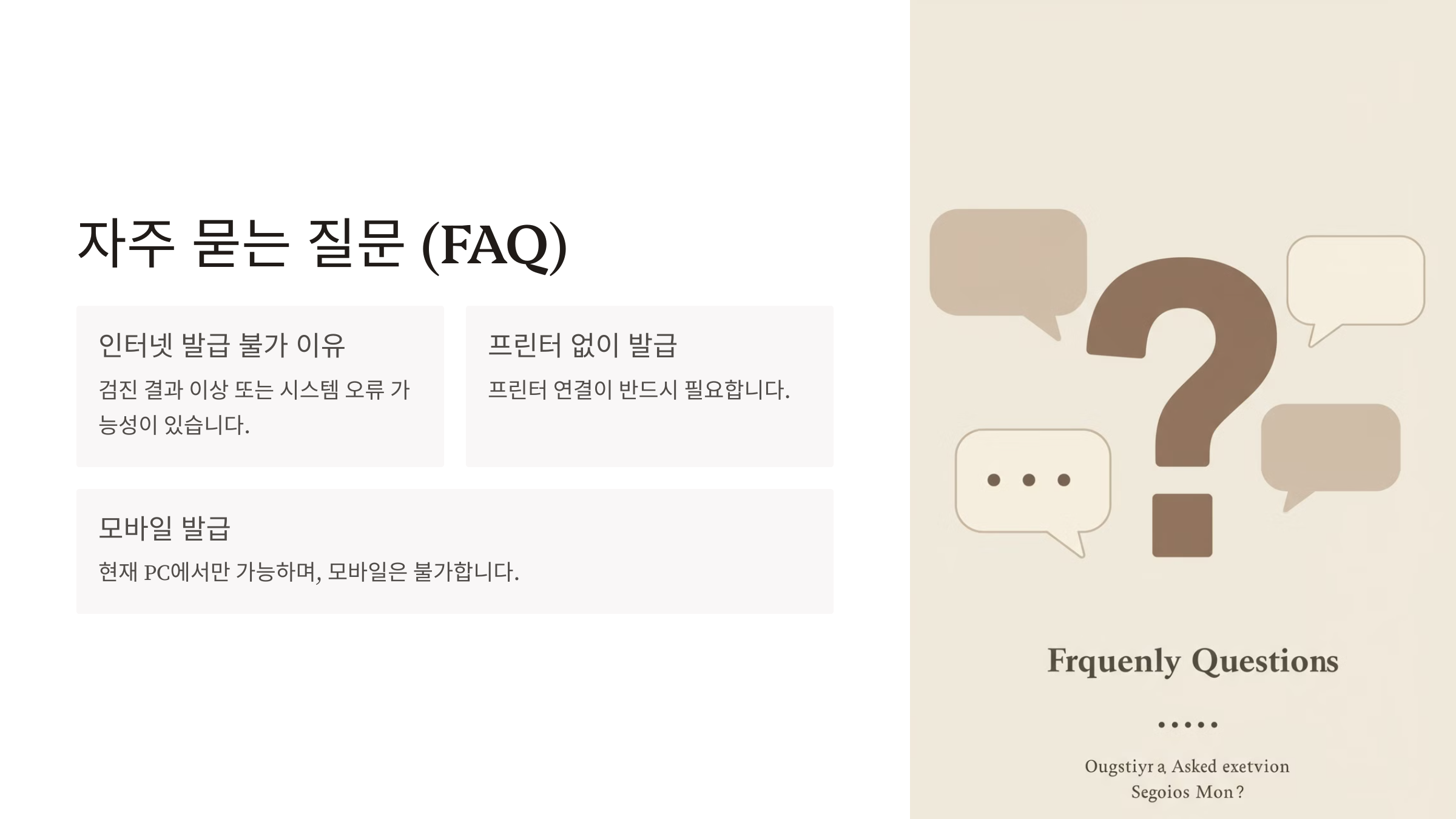 | 🖨️ 발급 & 출력 | 프린터로 출력 후 사용 가능 |