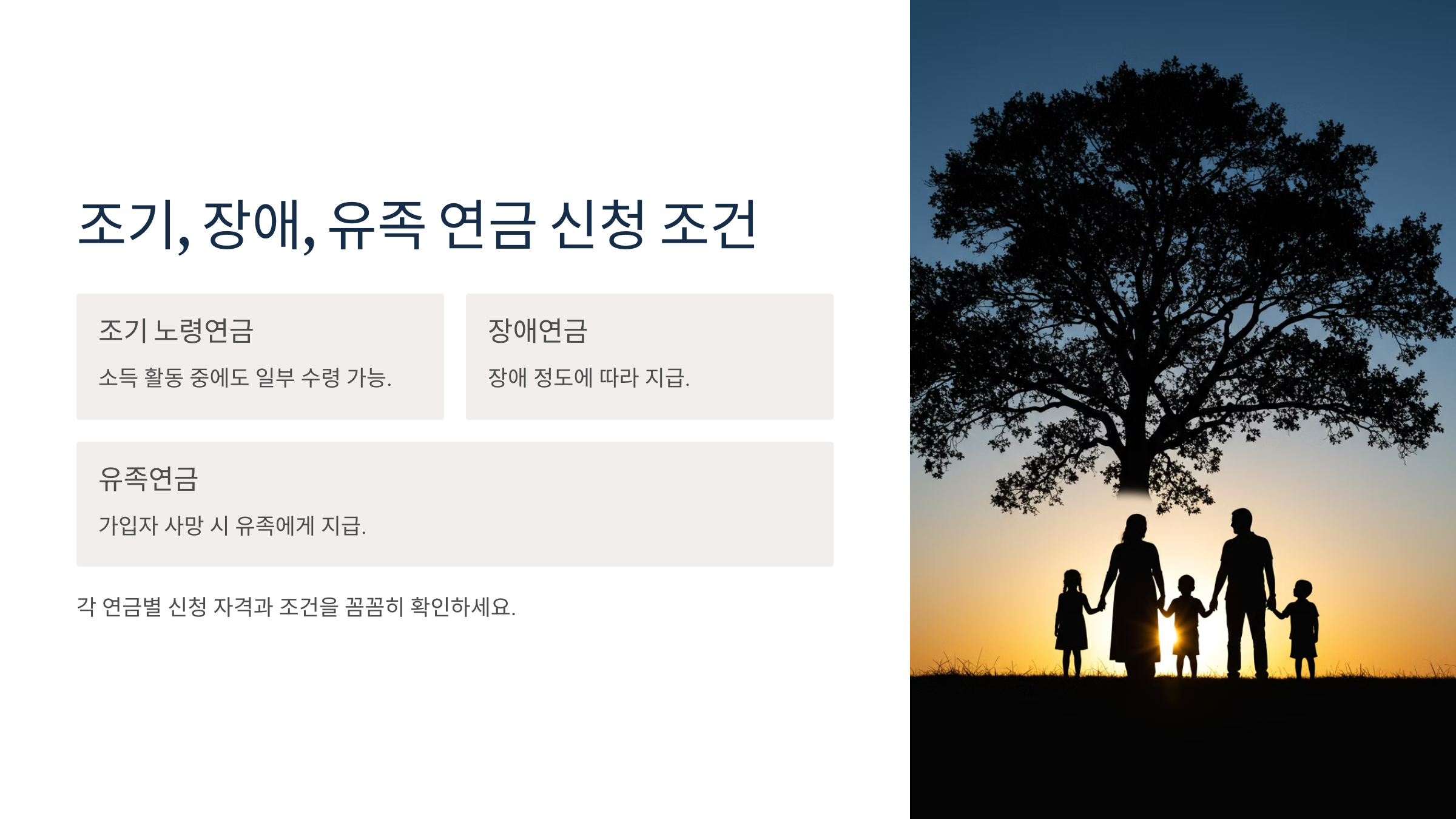 경제적 사정이나 건강 상태에 따라 조기 노령연금, 장애연금, 유족연금을 신청할 수 있어요. 각각의 조건과 신청 방법을 확인해 보세요! ✅