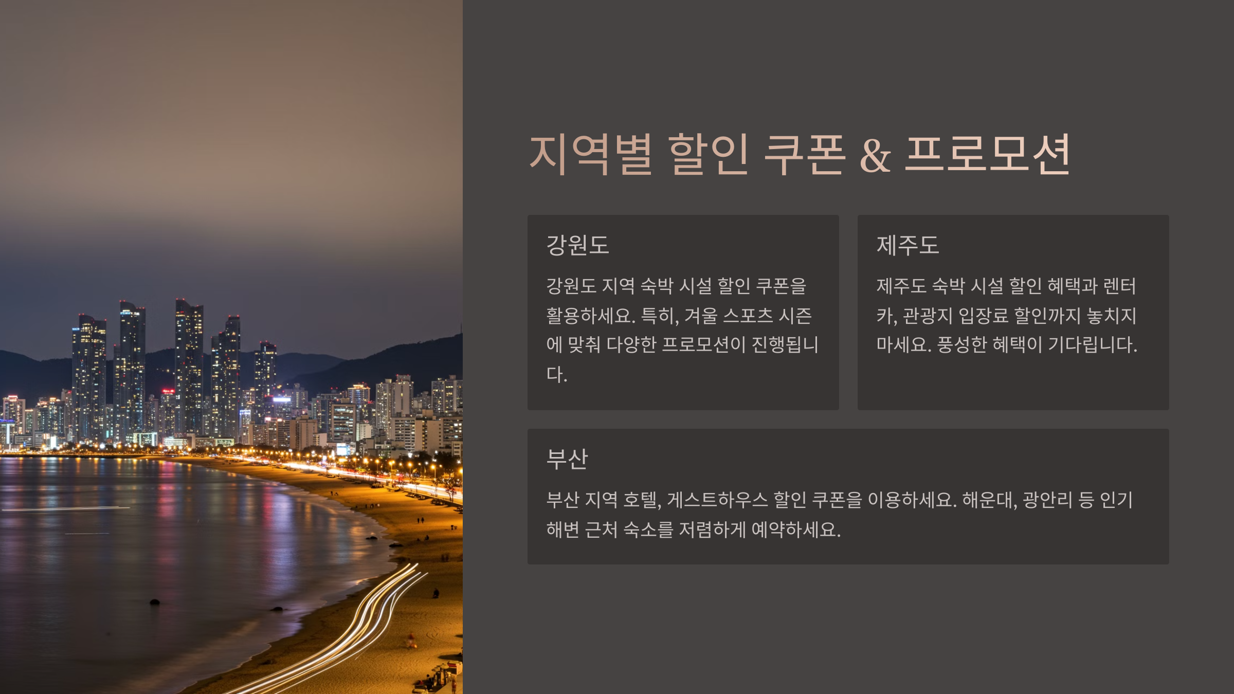 | 지역 | 할인 쿠폰 종류 | 최대 할인 금액 | 적용 가능 숙박업소 |