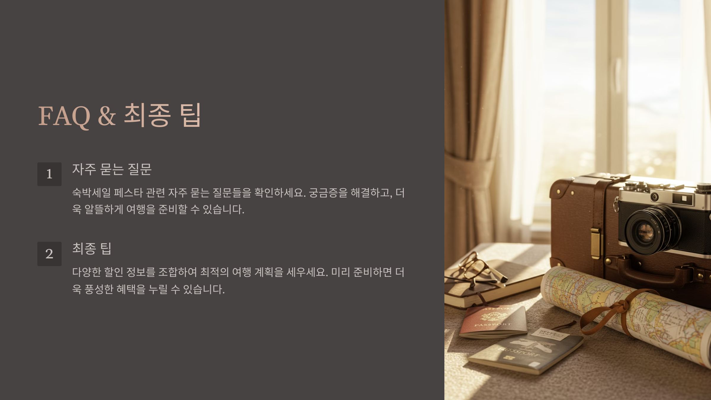 A3. 각 지역 관광청 또는 숙박 예약 사이트에서 제공하는 쿠폰 다운로드 이벤트를 활용하면 할인받을 수 있어요. 카드사·여행사 프로모션도 함께 확인하세요! 💰