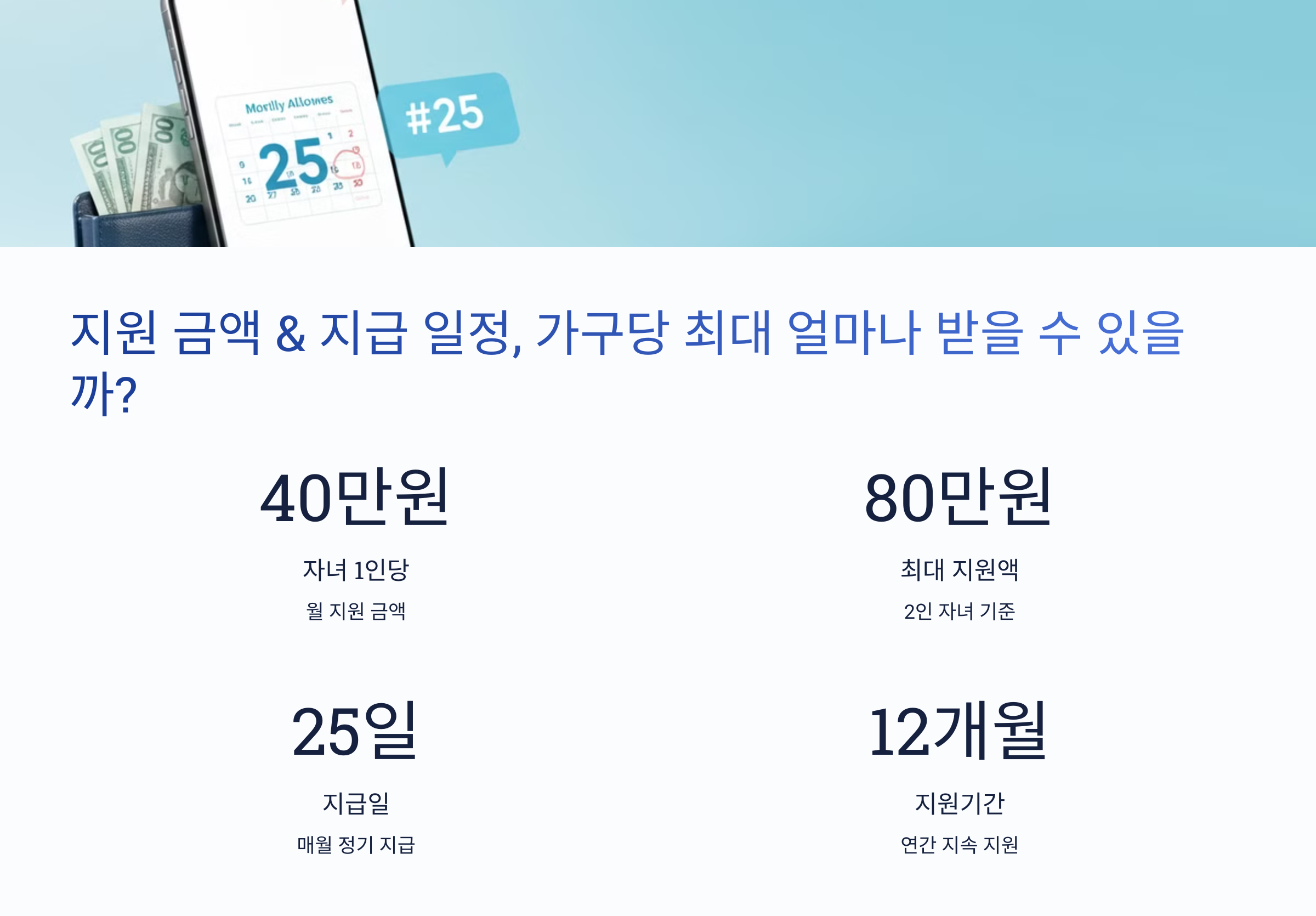 | 자녀 수 | 월 지원 금액 | 연간 최대 금액 |