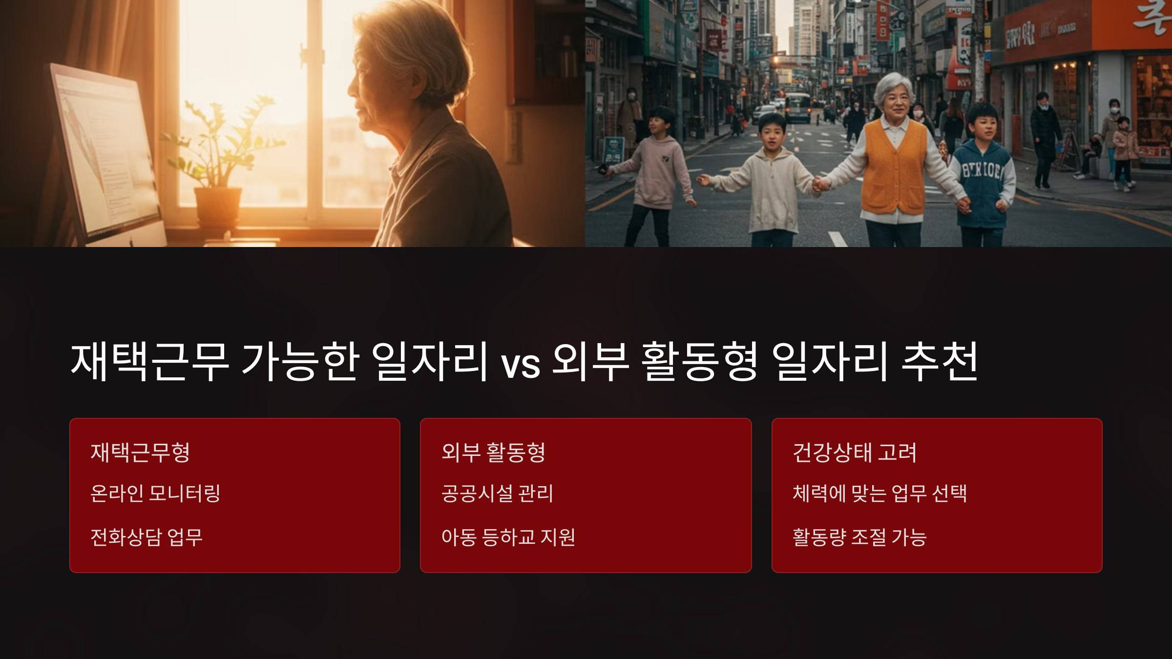 "밖에서 일하기 힘들어요!"라는 70대 어르신들도 걱정 마세요! 재택근무 가능한 일자리도 있고, 체력을 고려한 외부 활동형 일자리도 있어요. 🏠💻🚶