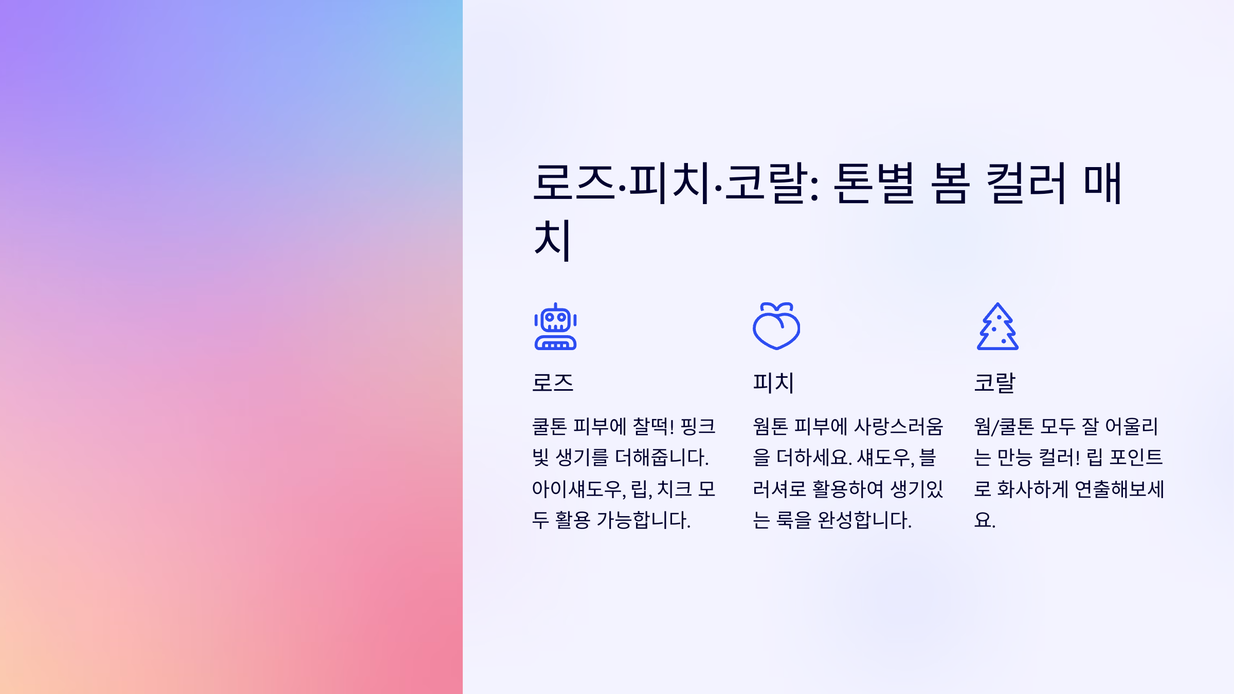 | 🌸 봄 웜톤 | 코랄, 피치 오렌지 | 생기 있는 따뜻한 느낌 |