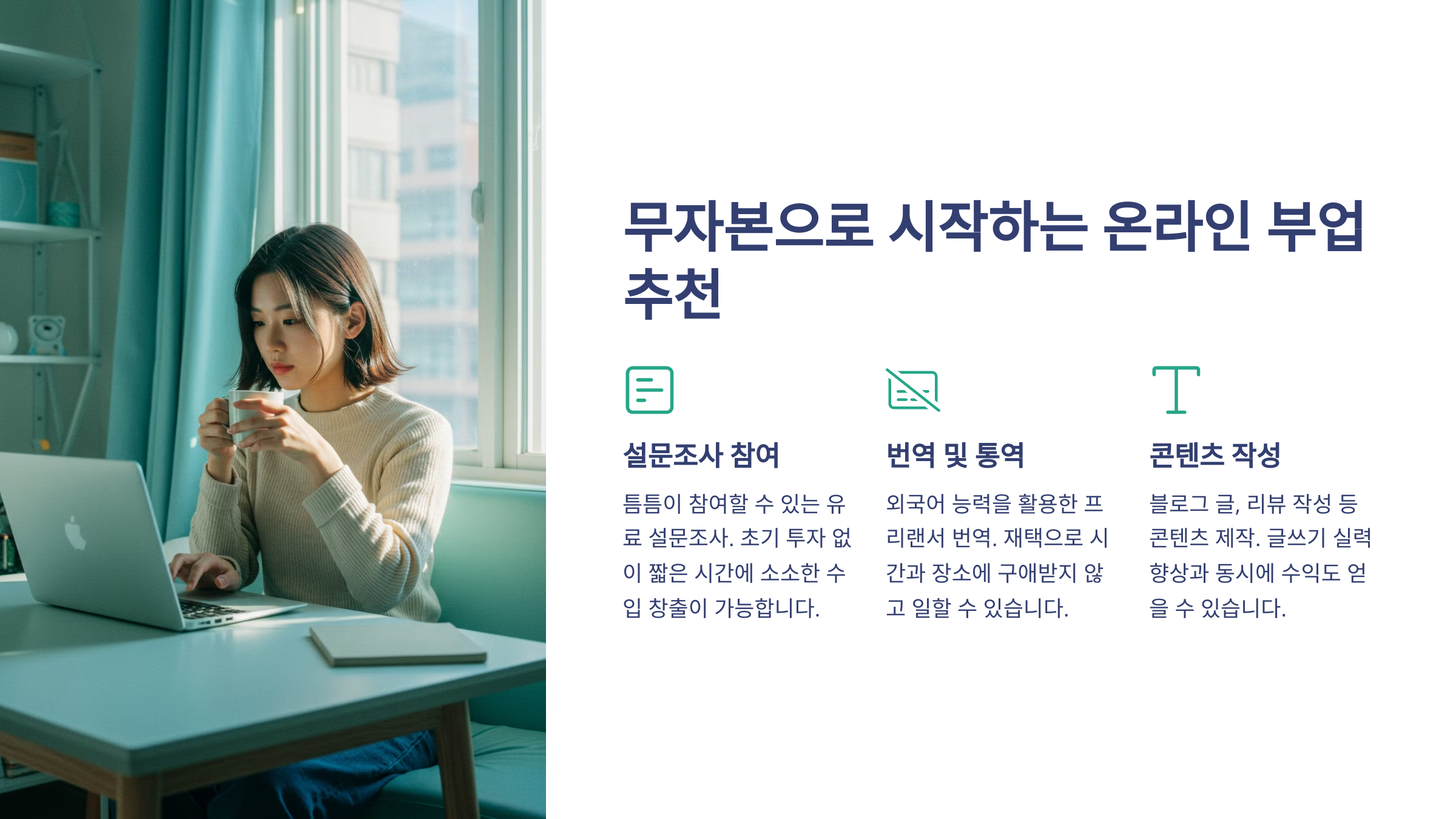 초기 투자 없이, 무자본으로도 시작할 수 있는 부업이 많아요! 💰 온라인 플랫폼을 활용하면 누구나 쉽고 빠르게 수익을 창출할 수 있어요.