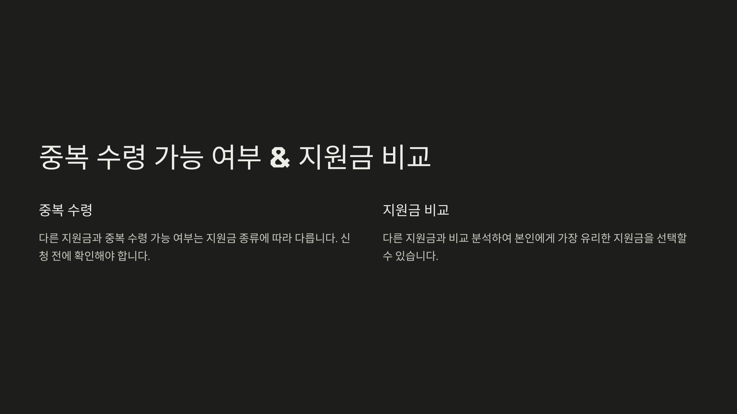 🔄 혹시 다른 지원금과 중복 수령이 가능할까요? 다음 섹션에서 중복 가능 여부 & 지원금 비교를 확인해 보세요! ✅