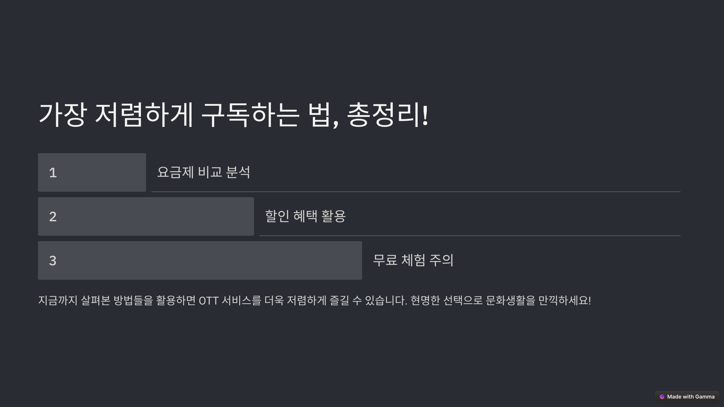 | 프로모션 활용 | OTT 할인 이벤트 및 카드 혜택 확인 |
