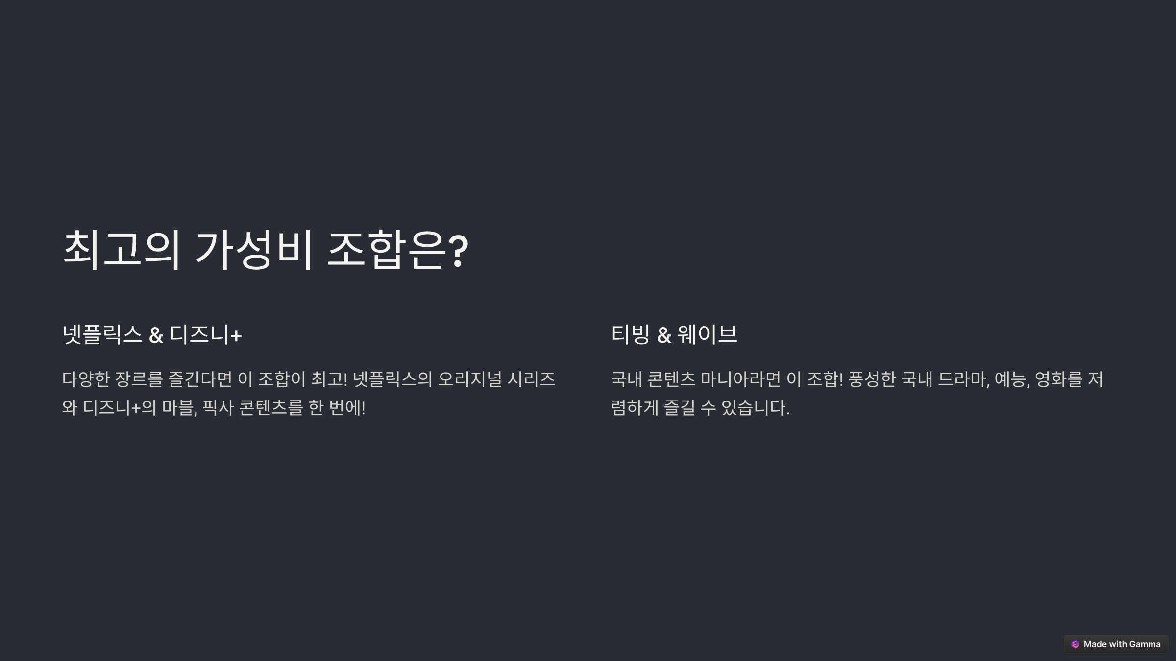 | 티빙 + 웨이브 | 한국 드라마 & 예능 최강 조합 | 약 15,000원 |