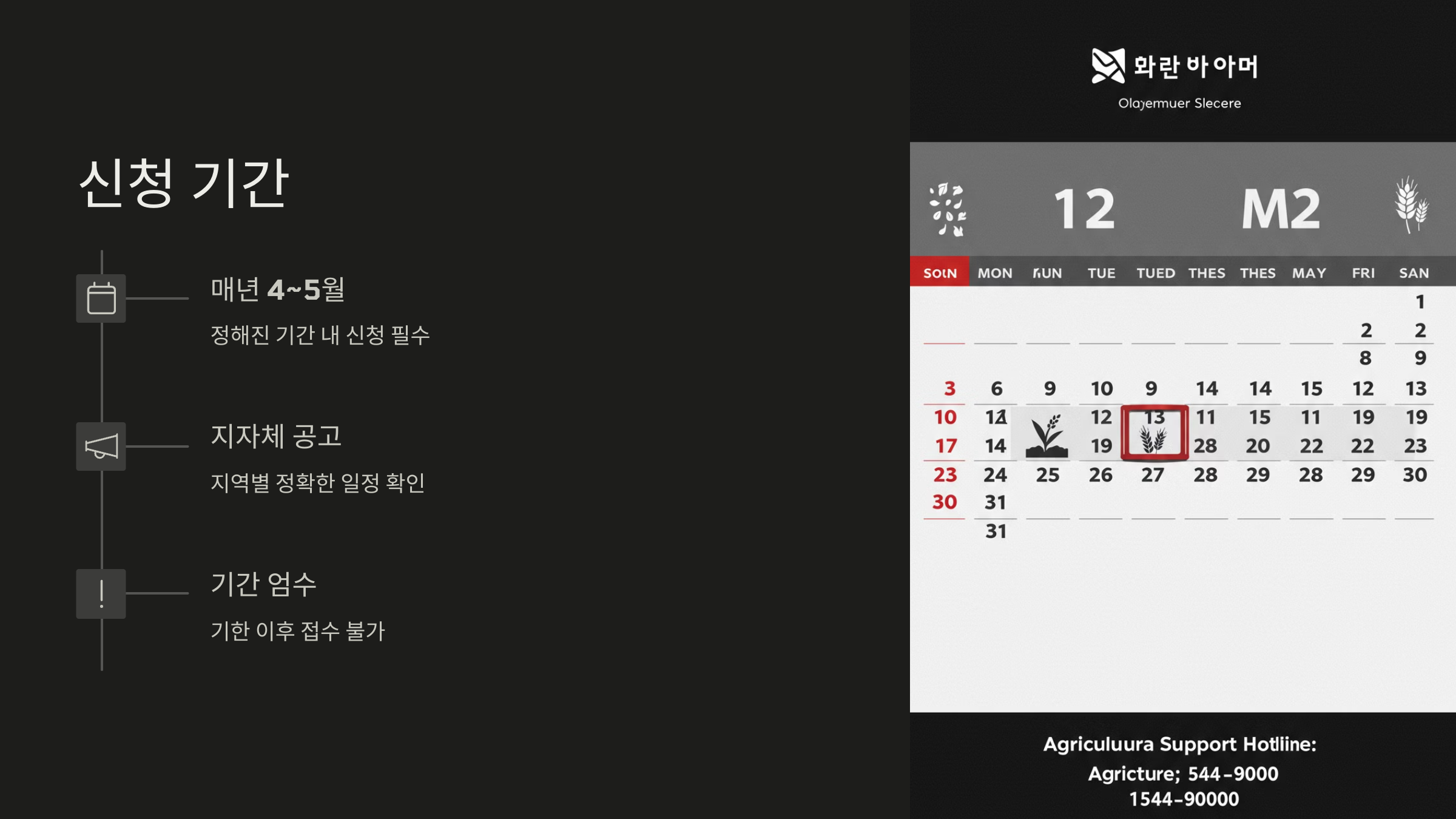 신청 기간은 보통 매년 4월~5월 사이로 진행돼요. 다만, 지자체별로 약간의 차이가 있을 수 있기 때문에, 주소지 관할 읍·면·동 주민센터 또는 농업기술센터, 농관원 홈페이지에서 공고를 꼭 확인해보세요.