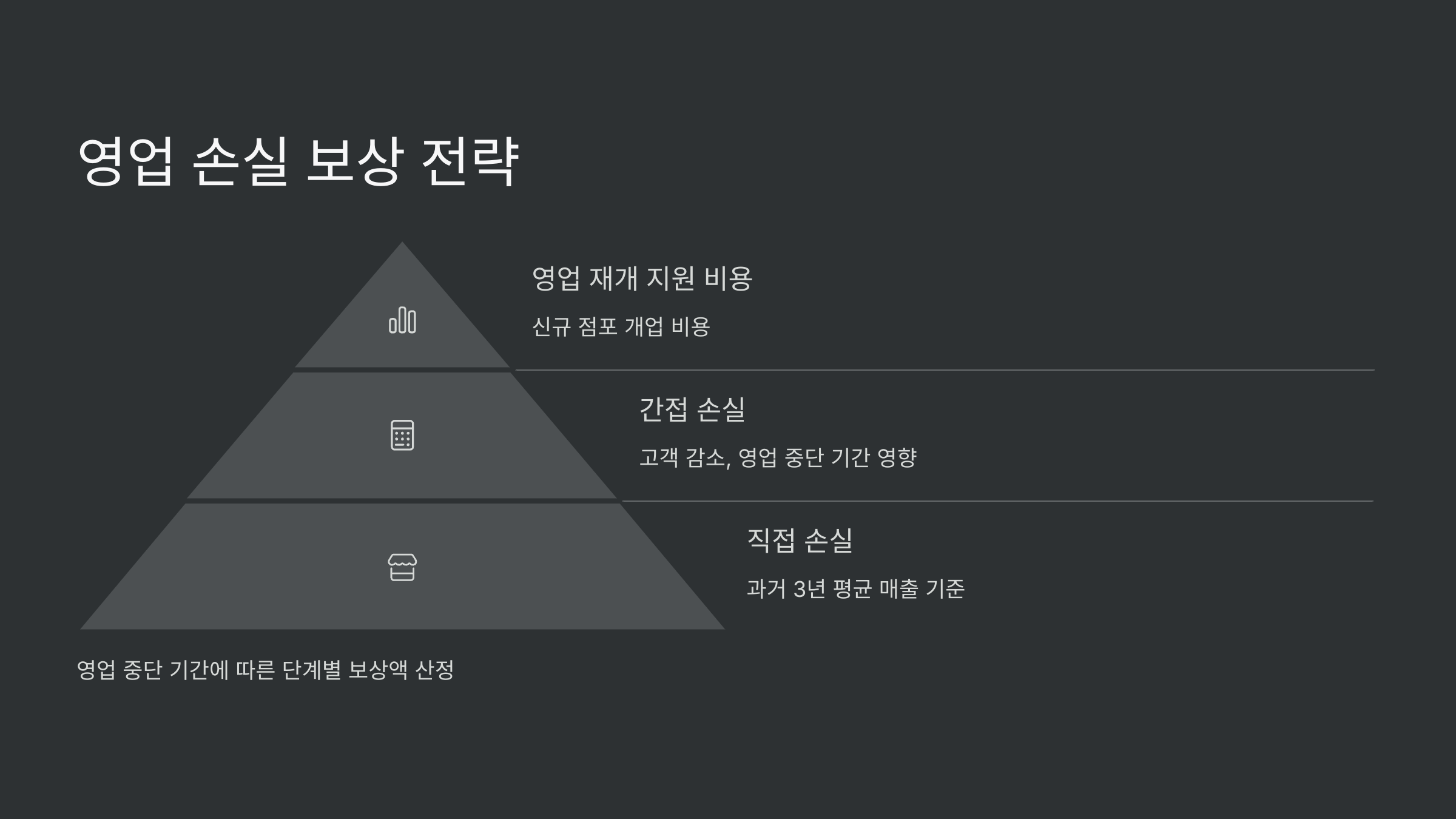 - 휴업 보상: 일정 기간 영업 중단 시, 월 평균 영업이익 × 보상기간