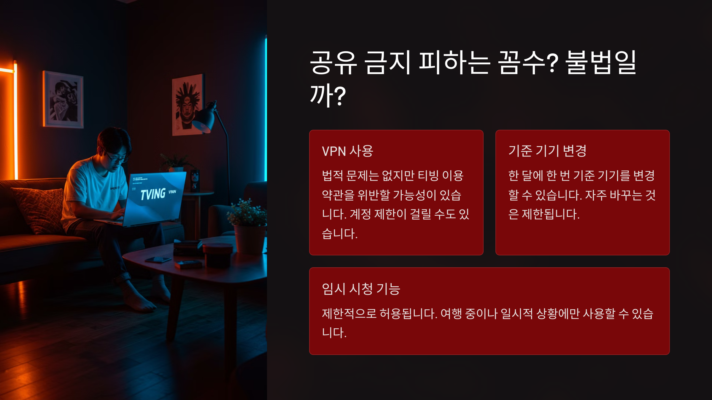 티빙은 최근 공식적으로 1계정 1가정 정책을 명확히 하며, IP 기반 기기 인증 시스템을 도입했어요. 쉽게 말해, 같은 집에서 접속하지 않으면 티빙이 ‘공유’라고 판단하고 접근을 막는 방식이에요. 과거엔 암묵적으로 허용되던 ‘친구와 나눠 쓰기’가 이제는 규정 위반이 된 거죠.