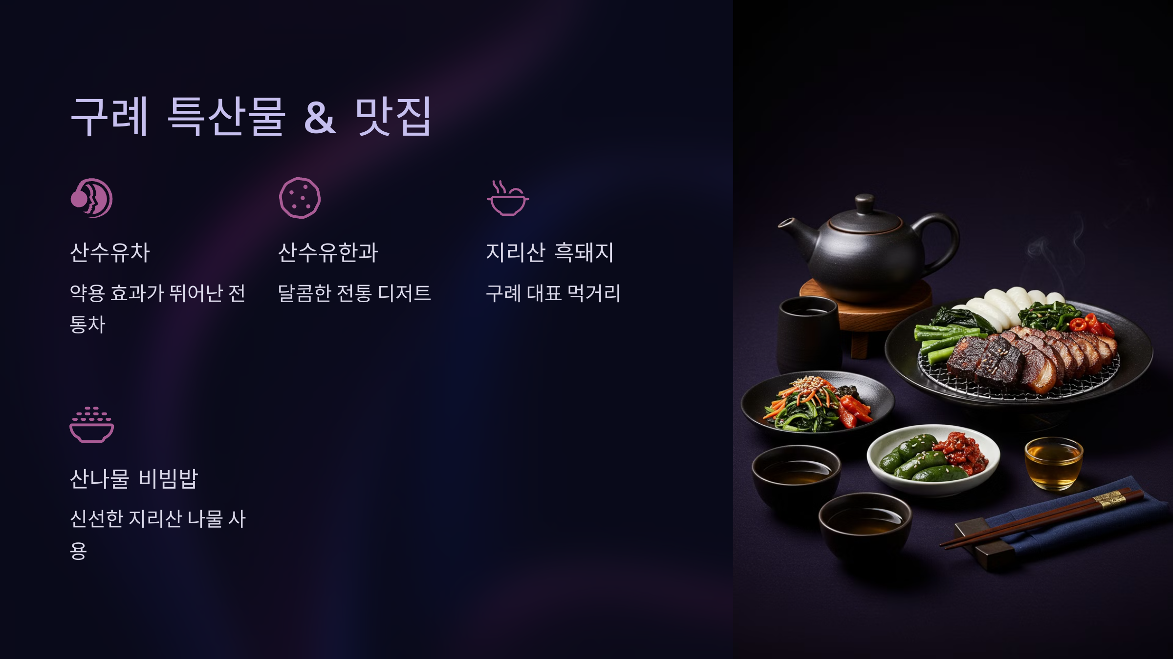 축제를 한껏 즐긴 후에는 구례에서만 맛볼 수 있는 별미도 빠질 수 없죠! 🍽️ 다음은 구례에서 꼭 먹어봐야 할 특산물과 맛집을 소개해 드릴게요.