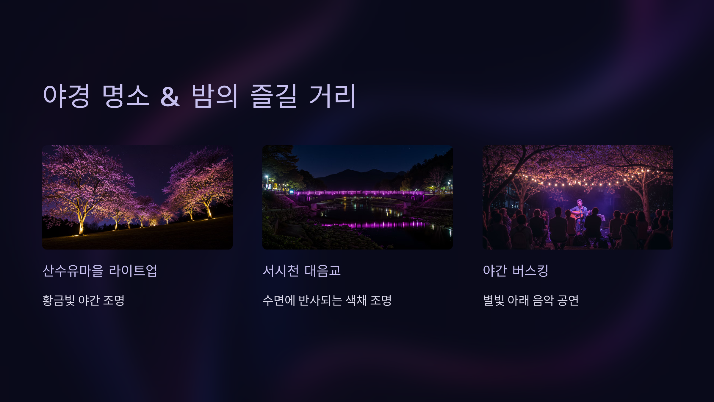 | 추천 활동 | 산수유꽃길 트레킹, 사진 촬영 | 야경 감상, 인생샷 촬영 |