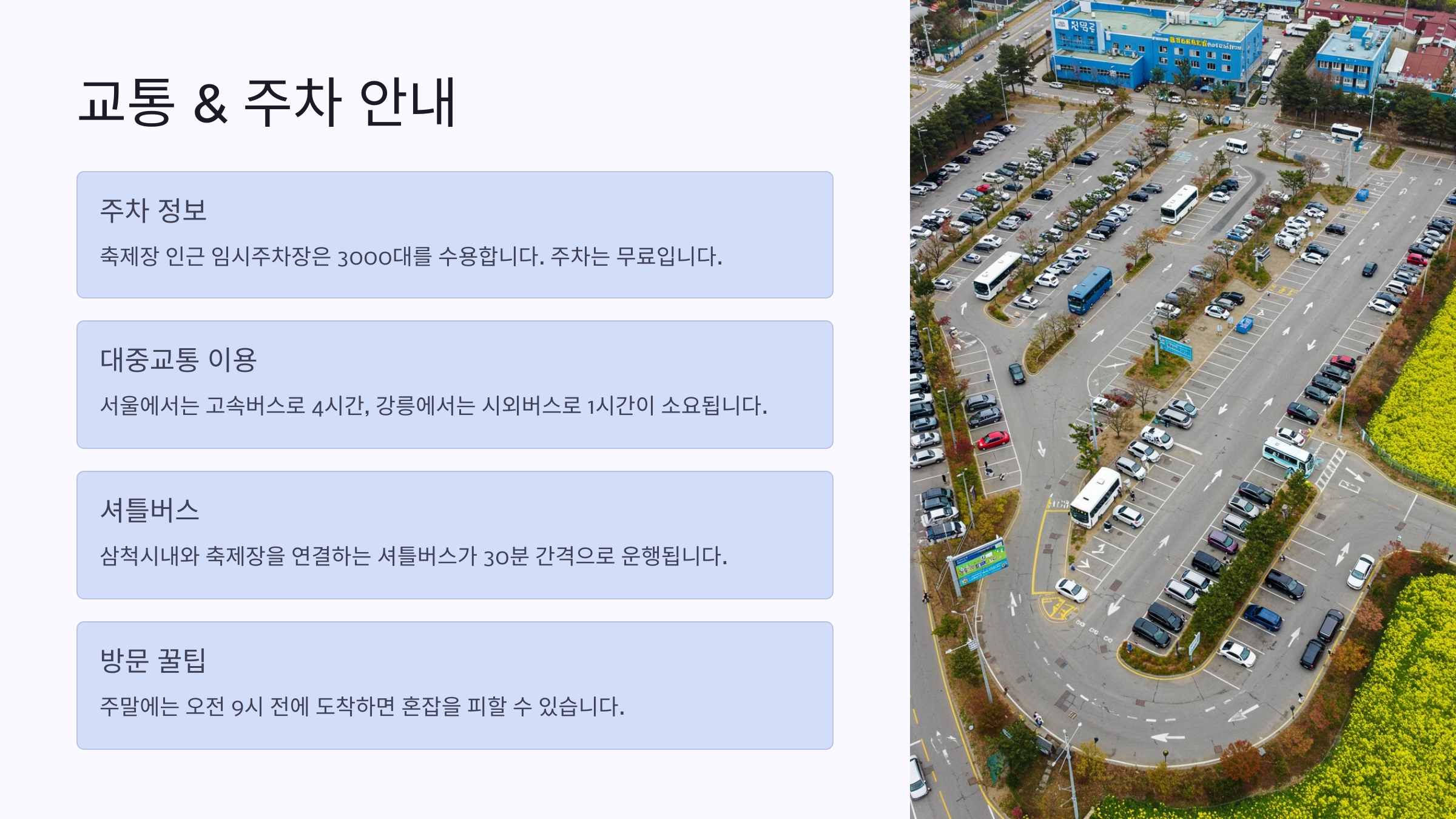 | 셔틀버스 | 삼척역·터미널 → 축제장 | 약 15분 |