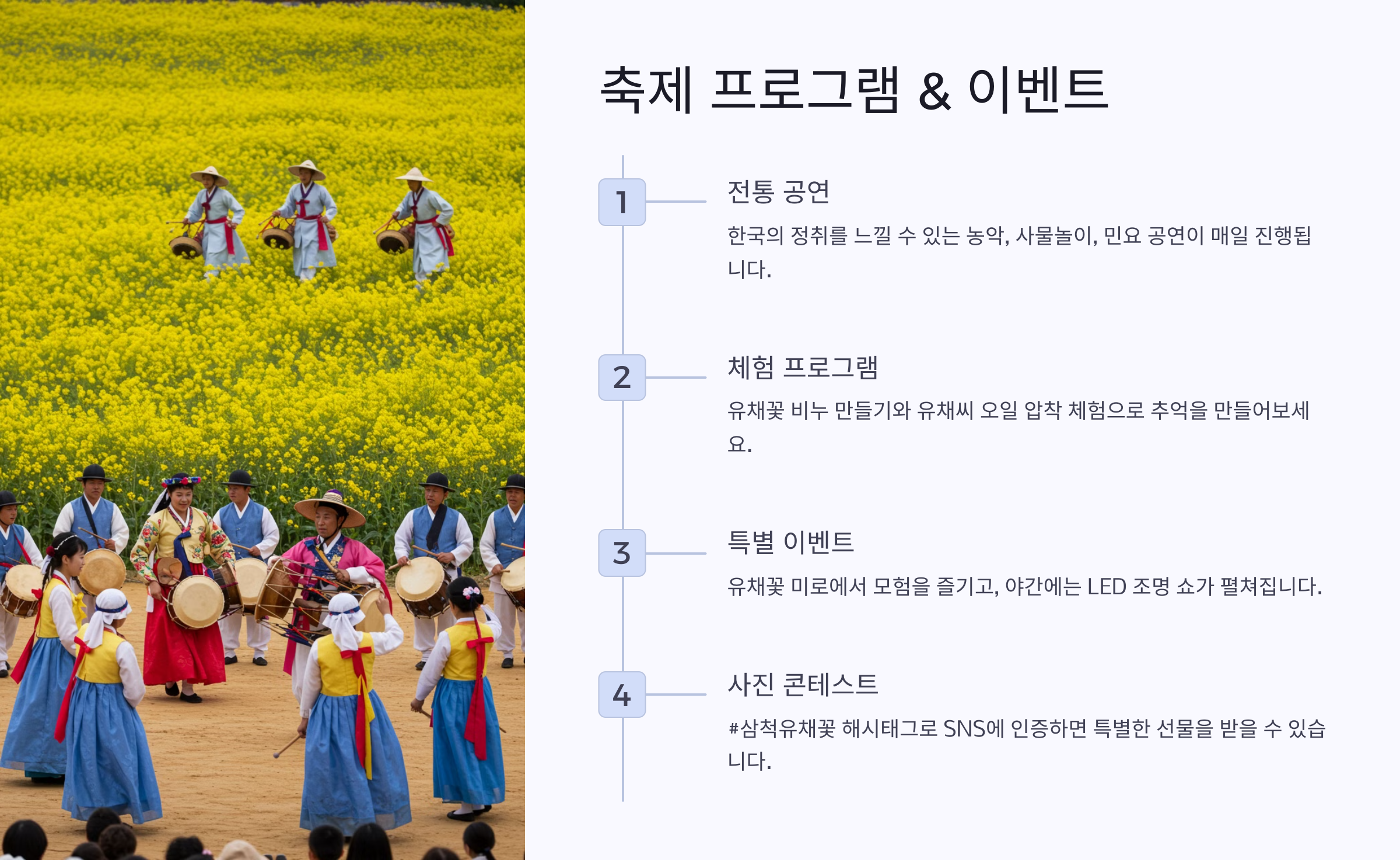 삼척 유채꽃축제에서는 전통 공연부터 다양한 체험 프로그램까지 즐길 거리가 가득해요! 가족, 연인, 친구와 함께 방문하면 더욱 알차게 보낼 수 있어요. 🎭✨