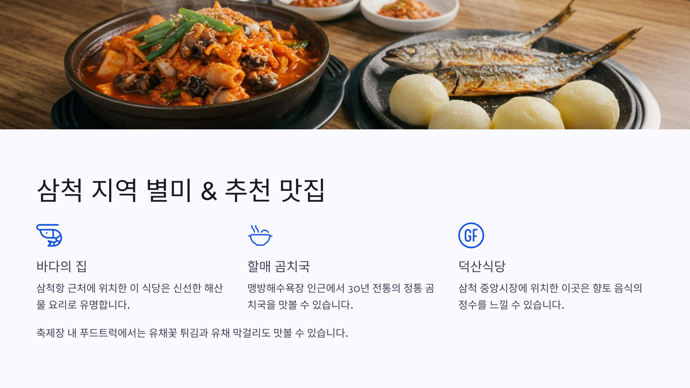 📌 삼척의 대표 먹거리로 든든하게 배를 채우고 축제를 더욱 즐겁게 보내세요! 🍜