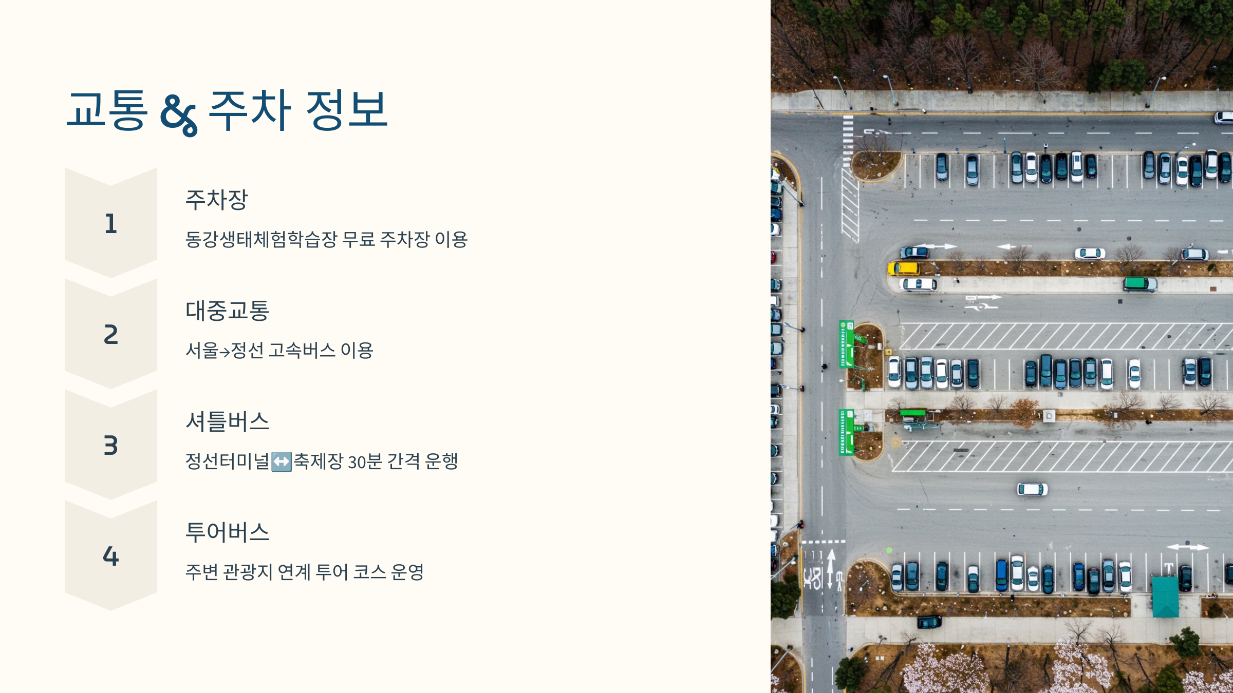 ✔️ 메인 주차장: 정선군 동강 주차장 (축제장까지 도보 10분)