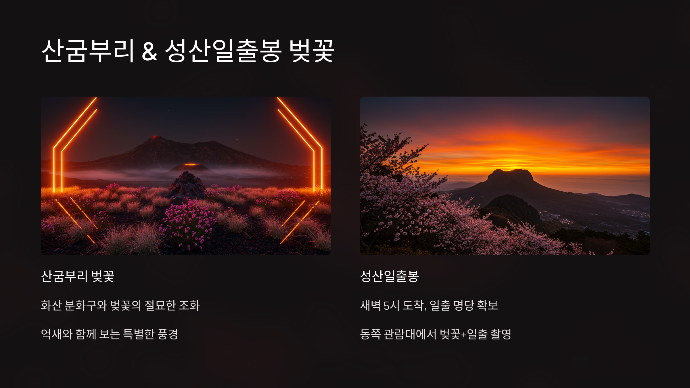 2일차: 성산일출봉 일출 & 벚꽃 감상 → 녹산로 벚꽃 드라이브 → 한라수목원 벚꽃길 🚗