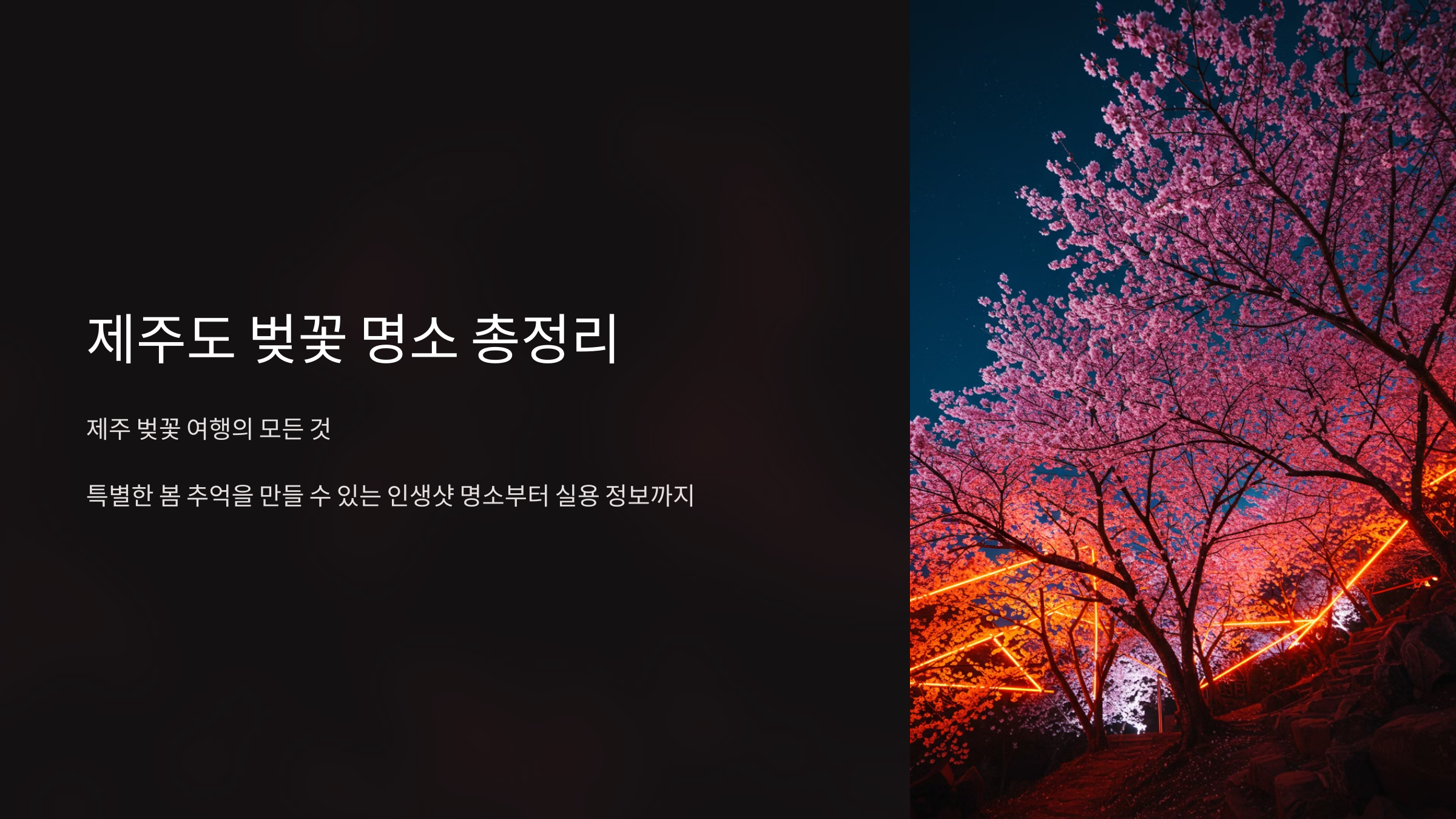 A3. 제주 왕벚꽃축제는 전농로 일대에서 열려요. 축제 기간에는 다양한 공연과 야경 조명이 더해져 더욱 화려한 벚꽃을 즐길 수 있어요. 🎶