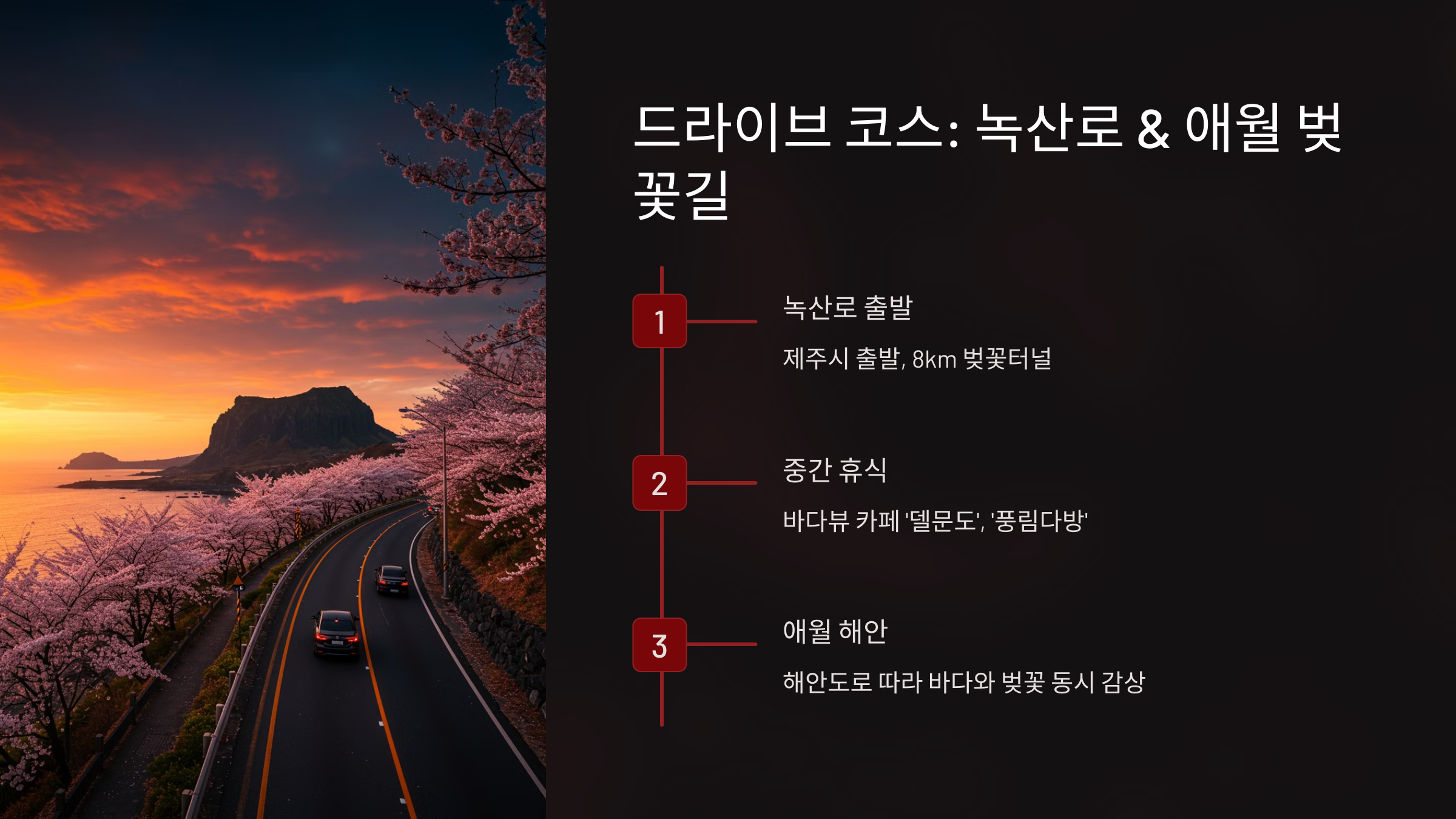 특히 제주에서 가장 유명한 벚꽃 드라이브 코스는 녹산로와 애월 벚꽃길이에요. 드넓은 풍경과 함께 화려한 벚꽃길이 펼쳐져 있어서 제주 봄 여행의 필수 코스로 손꼽혀요! 🌸