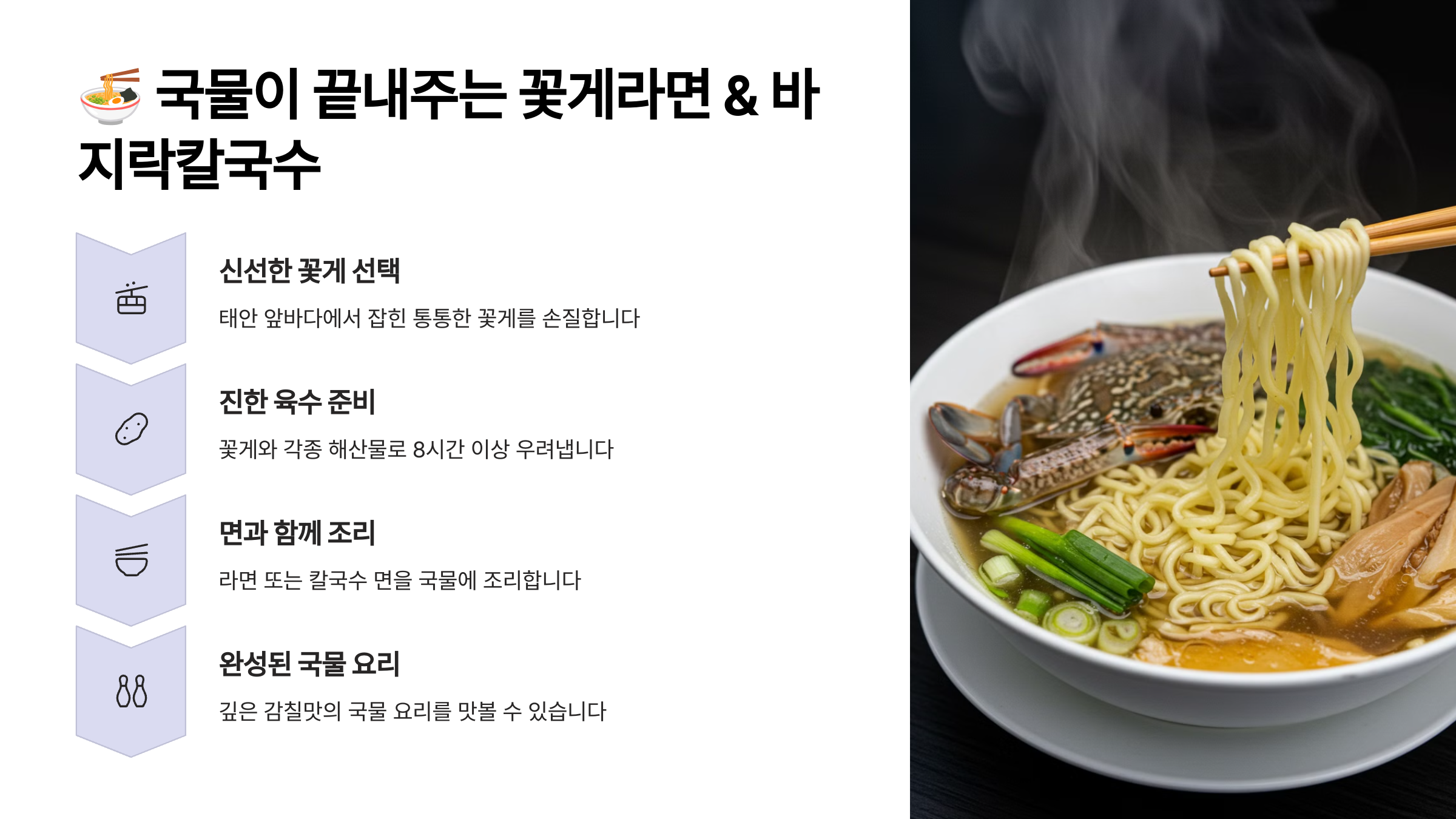 속 든든하게 채웠다면, 다음은 국물파 취향 저격! 꽃게라면 & 바지락칼국수 소개로 넘어갈게요. 국물까지 싹 비우고 나오게 될걸요?