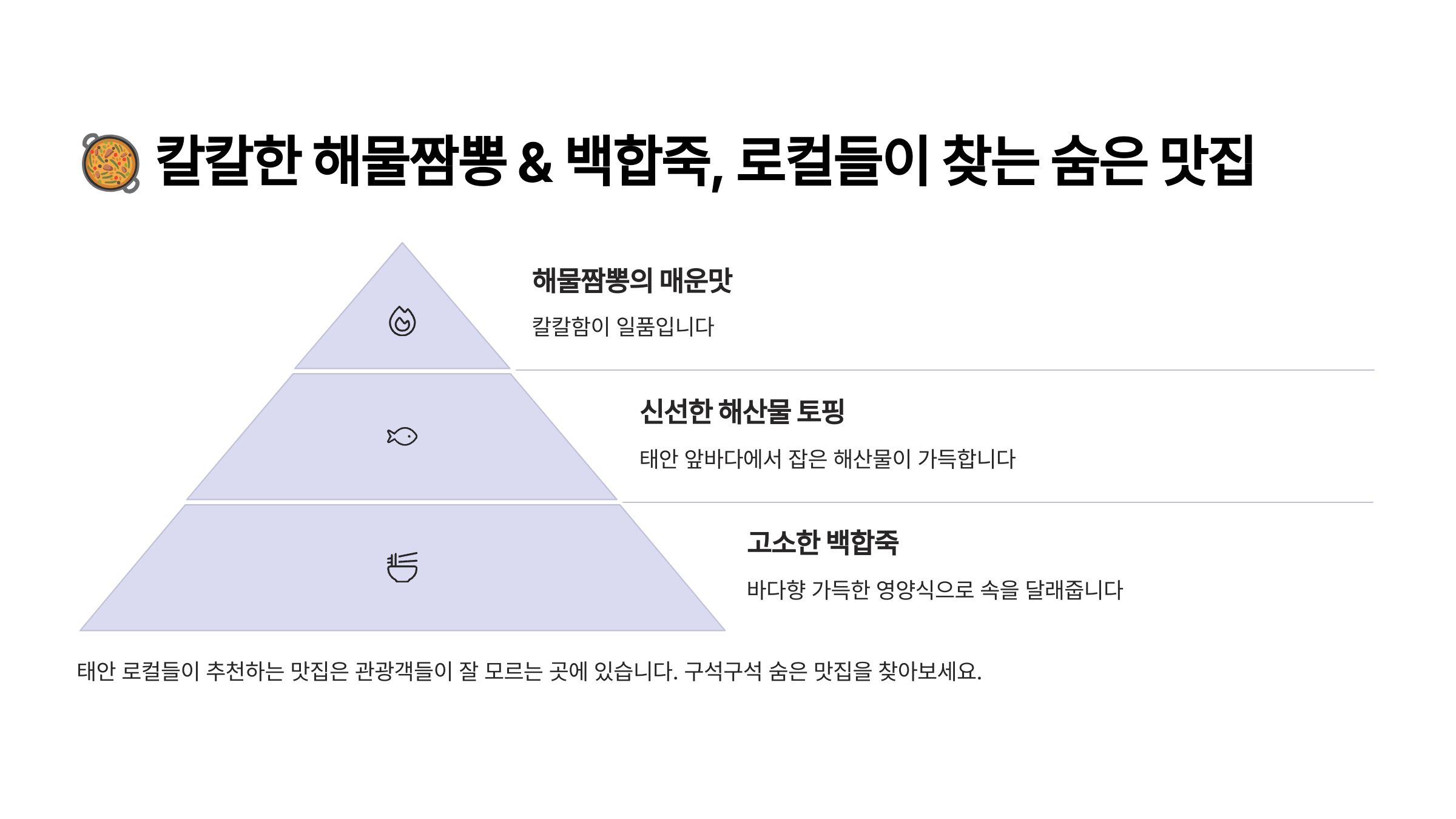 튤립축제를 보러 태안에 왔다면, 절대 그냥 집에 돌아가면 안 돼요! 태안은 맛집 천국으로 불릴 만큼 해산물, 국물요리, 로컬밥상, 뷰맛집까지 다양한 먹거리들이 가득하거든요. 현지인들이 진짜 자주 가는 찐 맛집만 모아서 정리했어요!