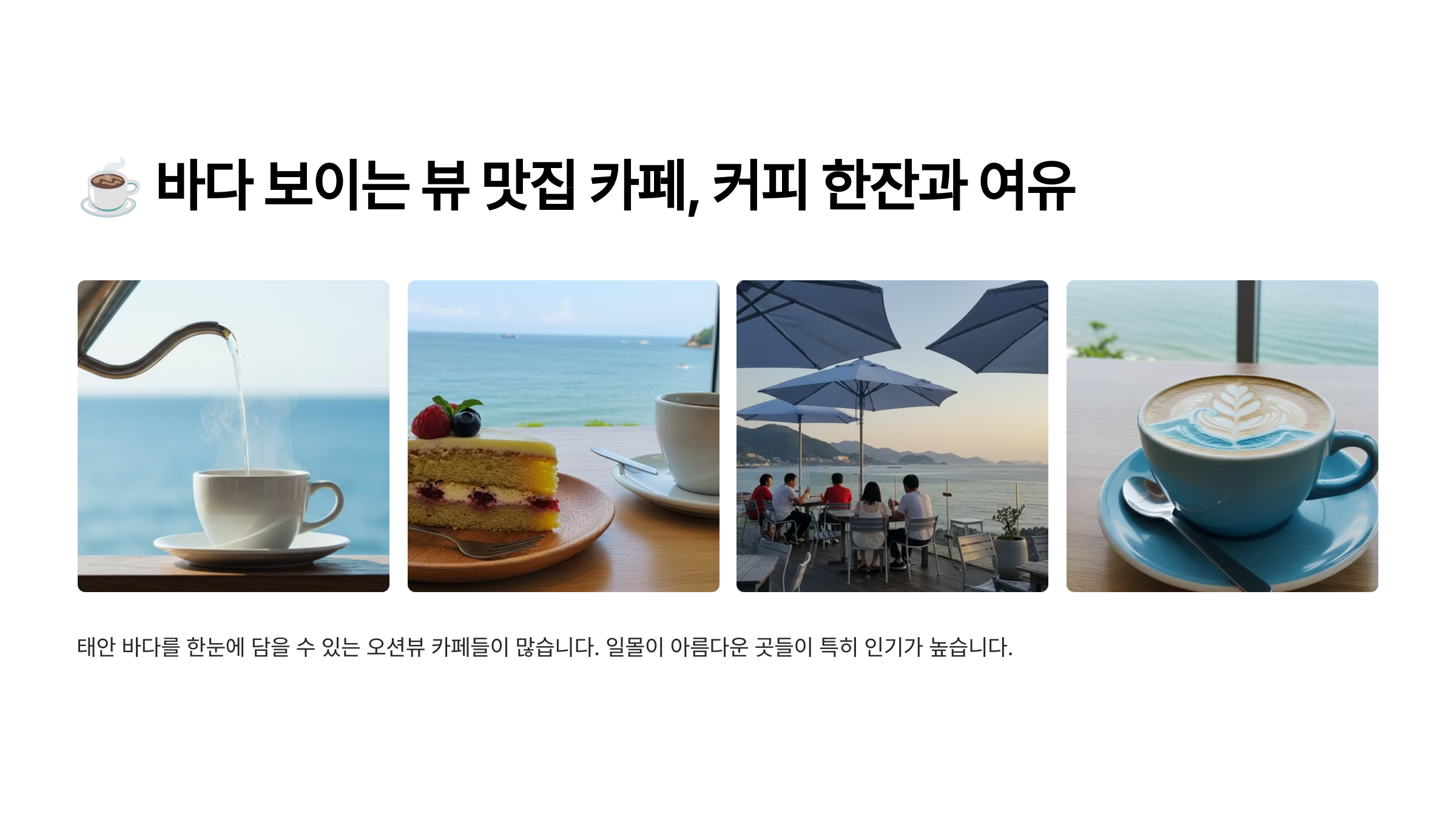 맛있는 식사를 마쳤다면, 이제는 바다를 바라보며 여유롭게 커피 한잔 즐겨볼까요? 태안에는 뷰가 다 한 감성 카페가 정말 많아요. 특히 꽃지해수욕장, 몽산포해변, 안면도 라인에는 루프탑·통창·선셋 명당이 가득해요.