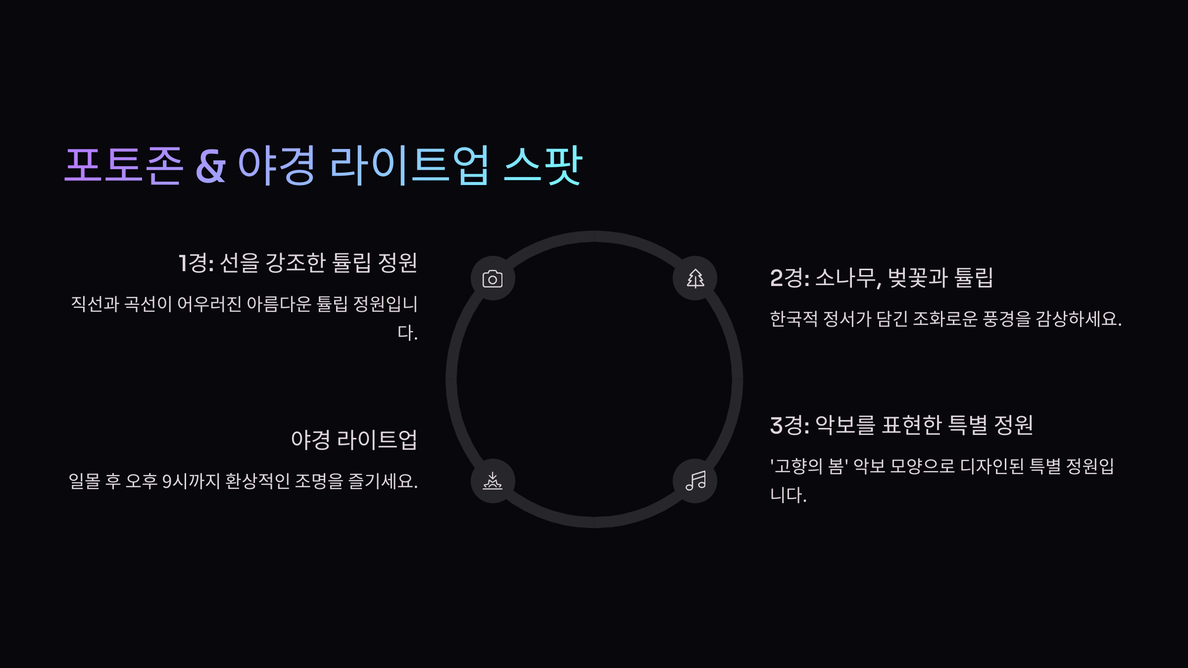 | 대형 튤립 조형물 | 입체 포토존, 야간 점등 | 18:30~20:30 |