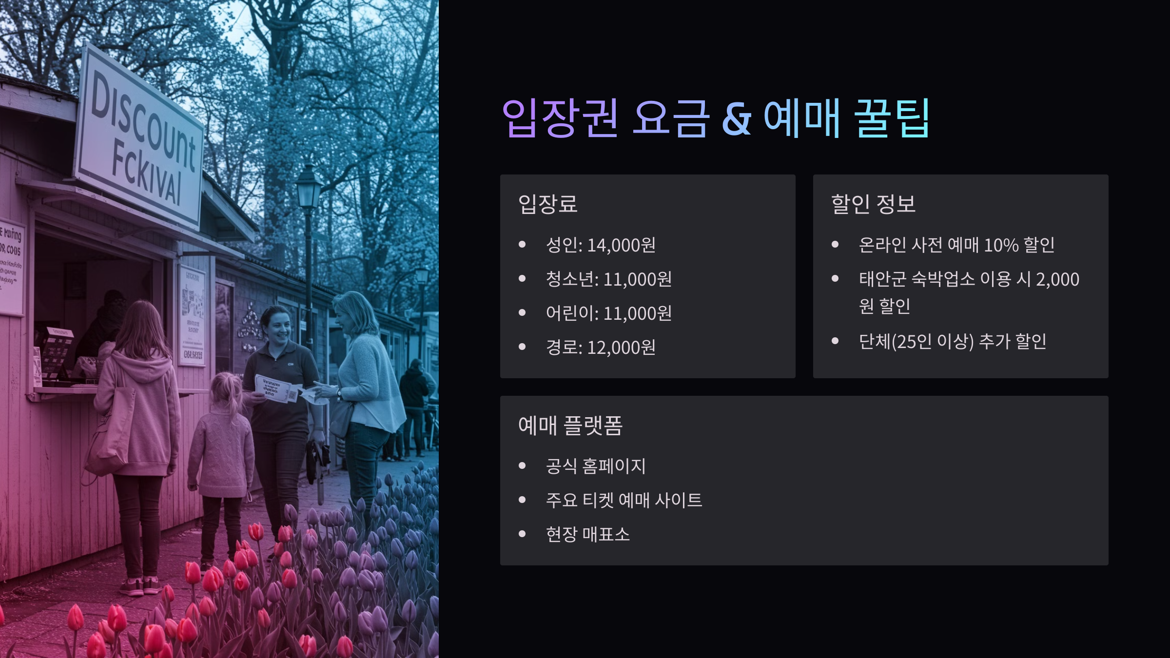 2025 태안 튤립축제의 입장권은 현장 구매와 온라인 예매 둘 다 가능해요. 하지만! 현장에서 줄 서는 것보다 미리 온라인으로 사는 게 훨씬 저렴하고 편하다는 거, 알고 계셨나요?