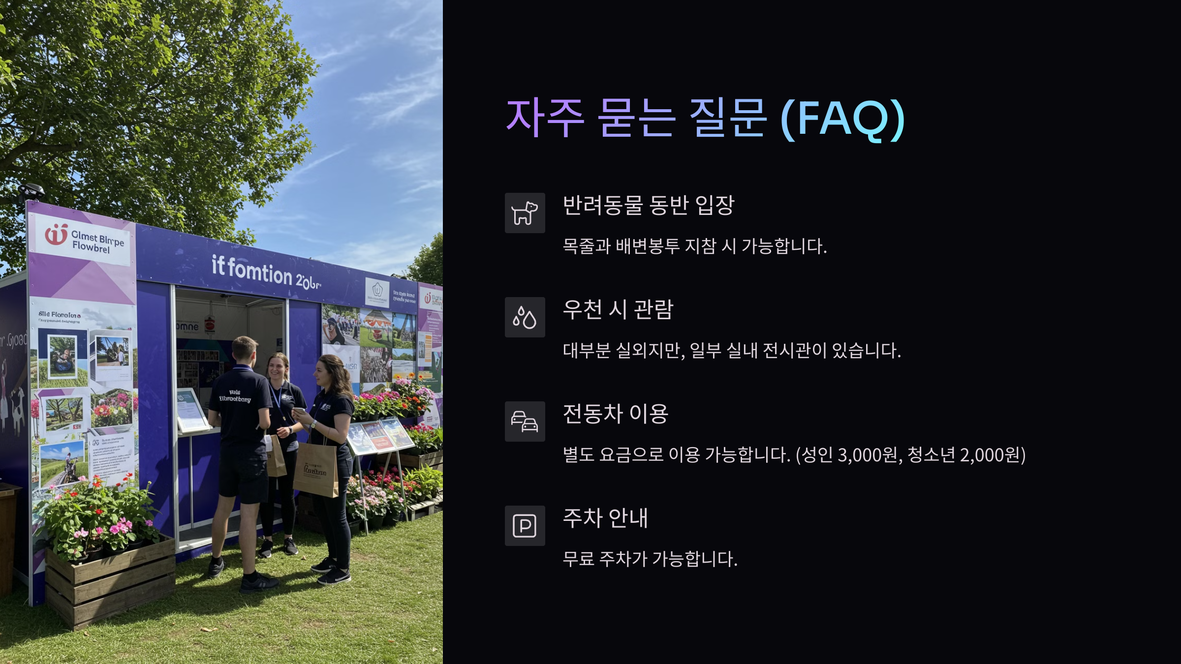 A1. 네! 튤립축제는 우천 시에도 정상 운영돼요. 단, 일부 야외 포토존은 통제될 수 있으니 투명 우비나 장화를 준비하면 좋아요.
