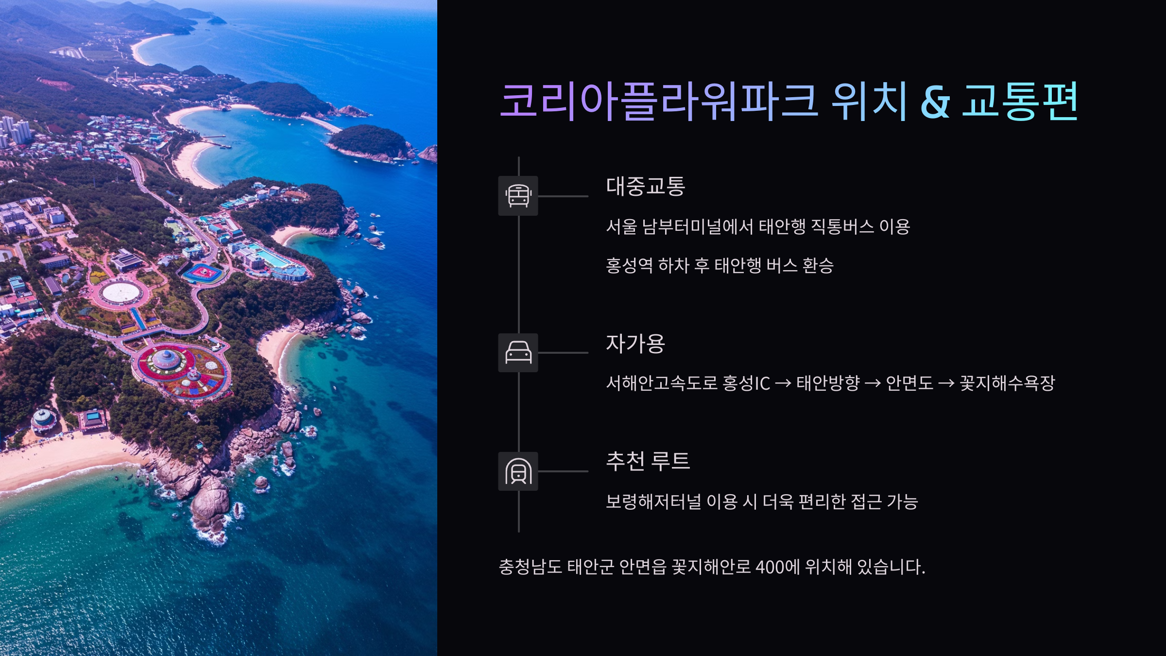 대중교통도 충분히 가능해요. 서울 고속버스터미널 → 태안터미널까지 직행버스가 1시간 간격으로 운행되고, 태안터미널에서 코리아플라워파크까지는 군내버스 or 택시로 약 20~25분 정도 소요돼요.