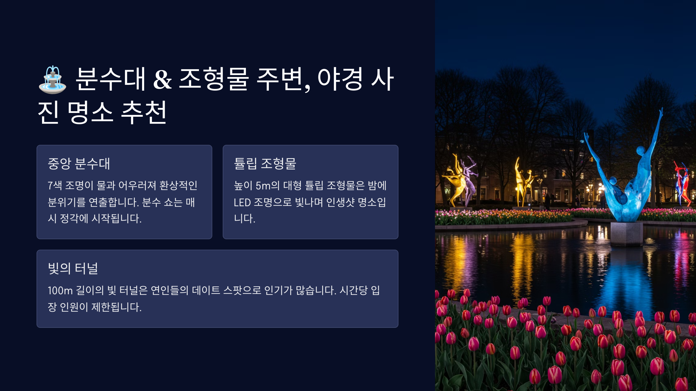 이제 무지개샷까지 완성했으면, 다음은 분수대와 조형물이 있는 야경 포토존 소개해드릴게요. 낮보다 더 로맨틱한 밤 분위기, 기대해도 좋아요!