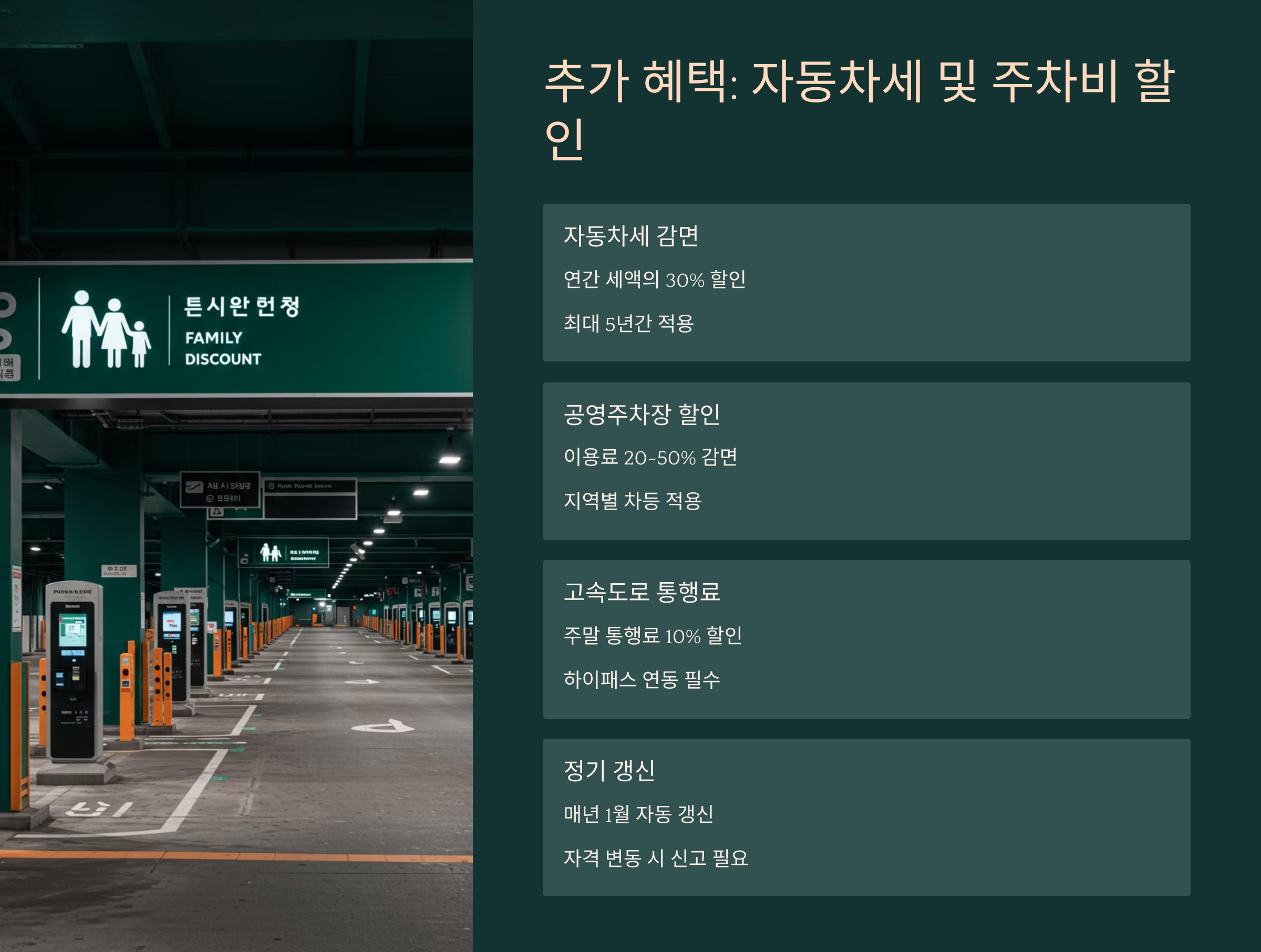자동차 취득세 감면 외에도 2자녀 가구가 받을 수 있는 추가적인 혜택이 많아요! 자동차세 할인부터 공영주차장 감면까지 놓치지 말고 챙겨 보세요. 🏆