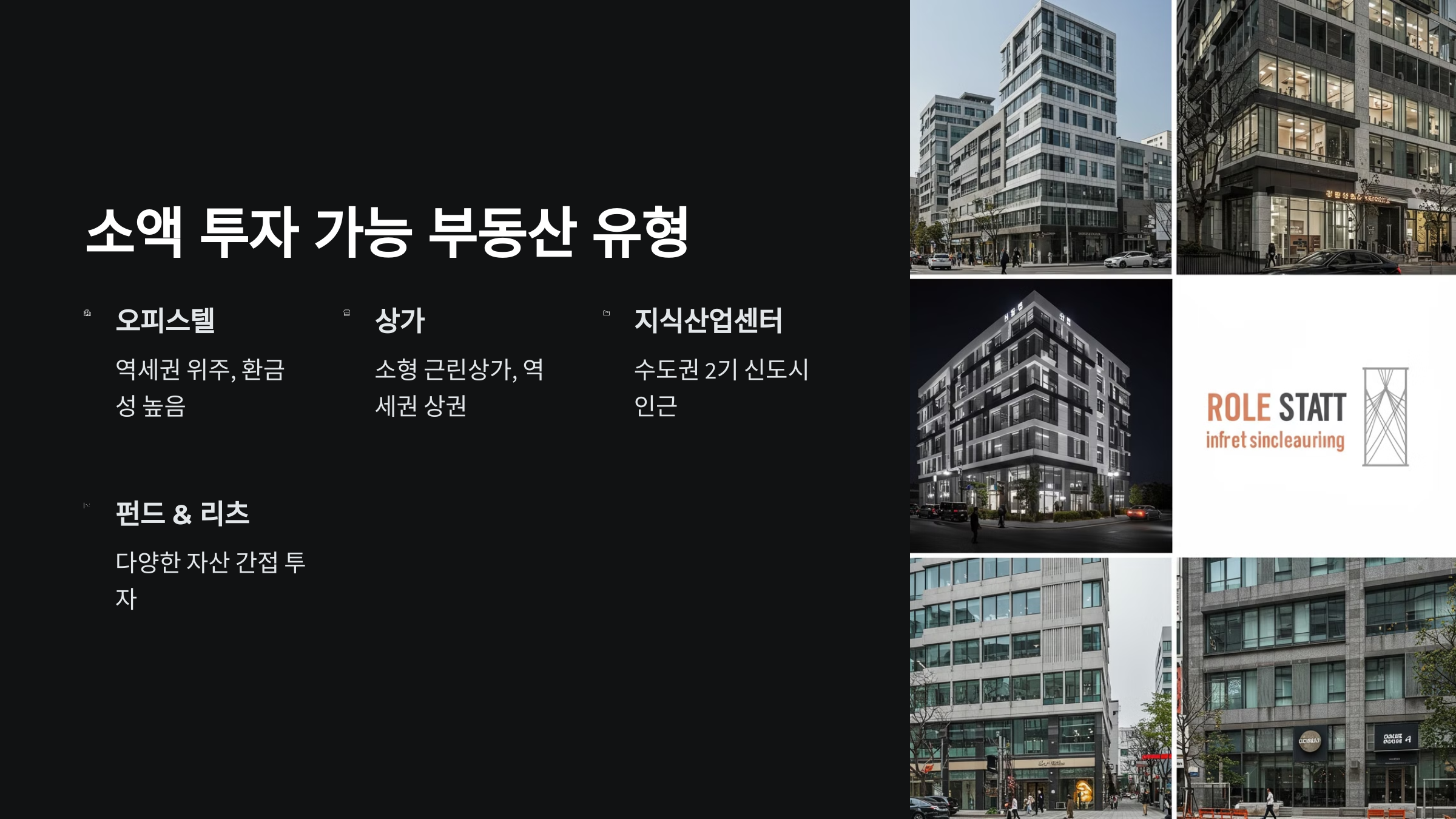 - 소형 오피스텔: 월세 수익 안정적인 직장인 밀집 지역 공략