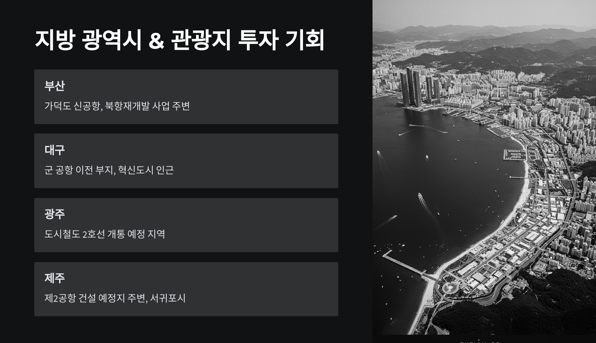 부산, 대구, 광주 등 광역시는 대규모 개발 사업이 진행 중이며, 제주·강원 같은 관광지는 숙박업 및 단기 임대 수익을 노릴 수 있어요. ✈️🏖️